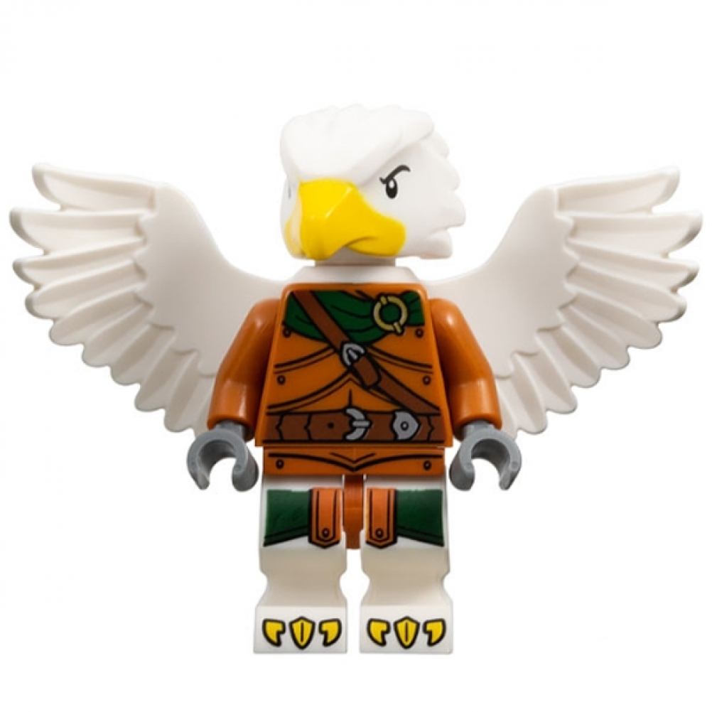 Minifigure di Aarakocra Ranger ispirata a Dungeons & Dragons. Presenta corpo alato giallo/arancione con torso stampato in stile armatura leggera verde e marrone. La testa alata ha becco arancione e occhi dettagliati, mentre le gambe sono corte e marroni per la statura tipica della specie. Dettagli degli artigli sono stampati sui piedi.