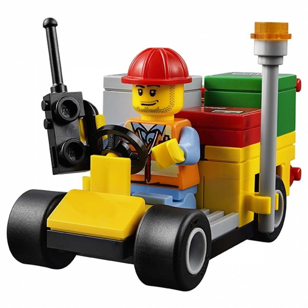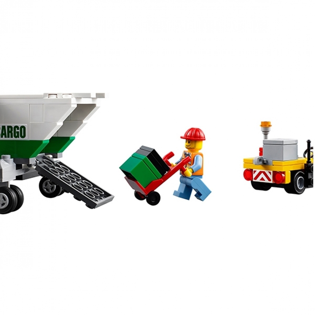 L'aereo è dotato di portellone posteriore apribile, carrello anteriore girevole, grandi motori e cabina di pilotaggio accessibile, oltre a un veicolo di servizio aeroportuale con carrello e spazio per 4 pacchi. Include 2 minifigure.