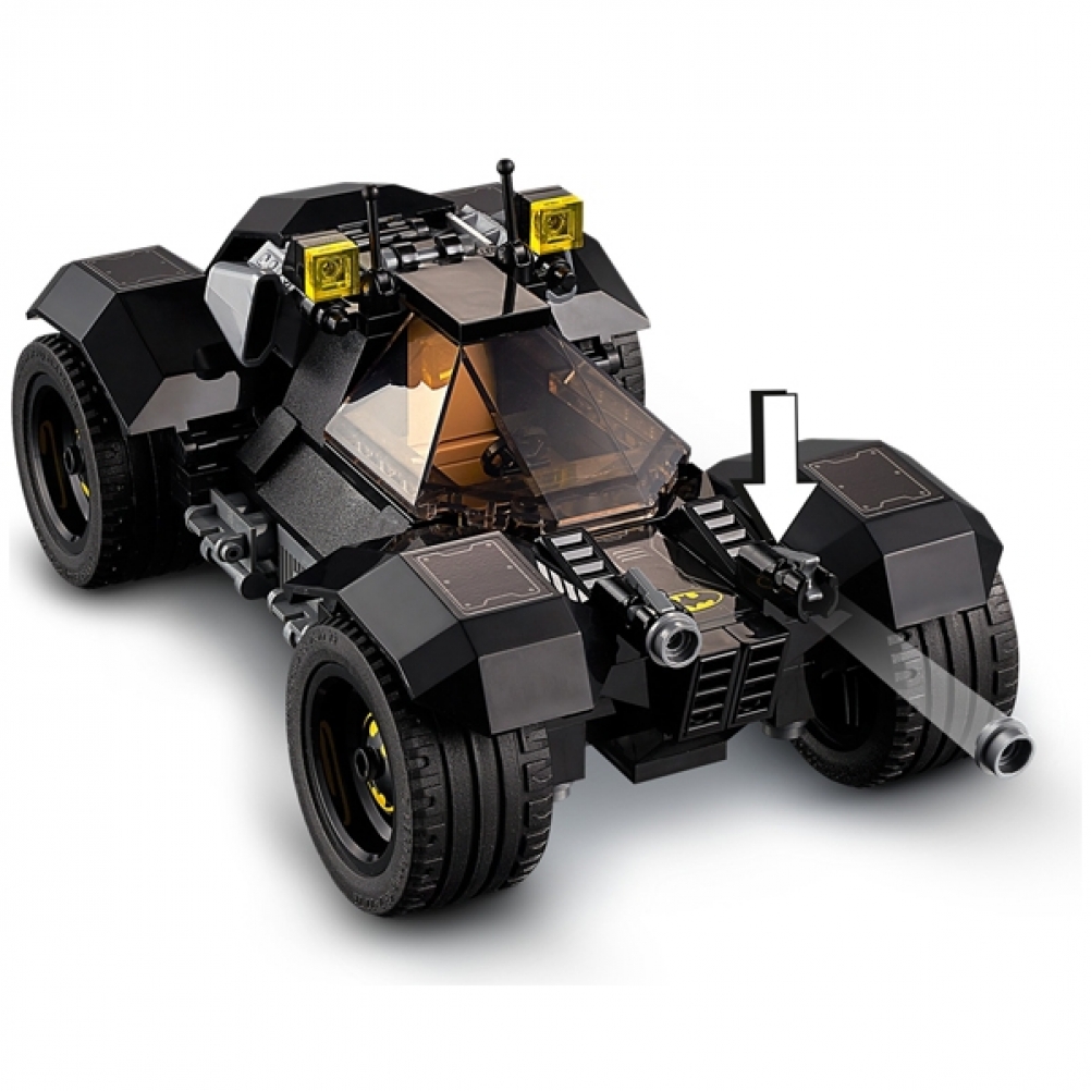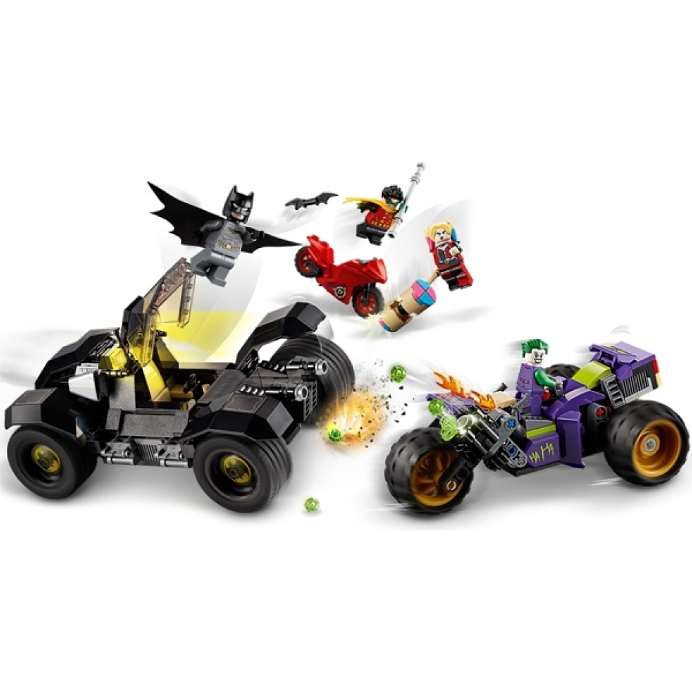 Include 4 minifigure e la Batmobile™, dotata di abitacolo apribile per posizionare la minifigure di Batman™ e di un motore rimovibile. La parte anteriore del tre-ruote di THE JOKER™ è formata da una bocca che si apre e si chiude quando il veicolo è in movimento.