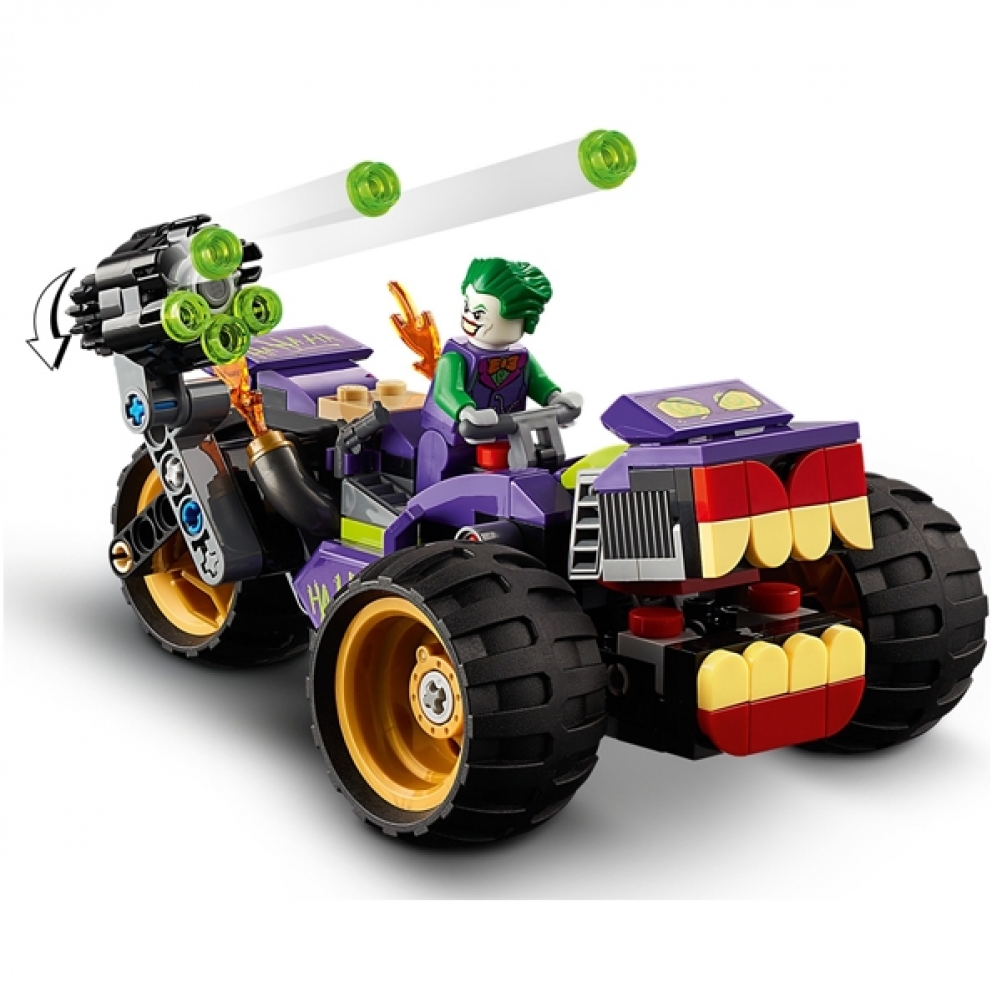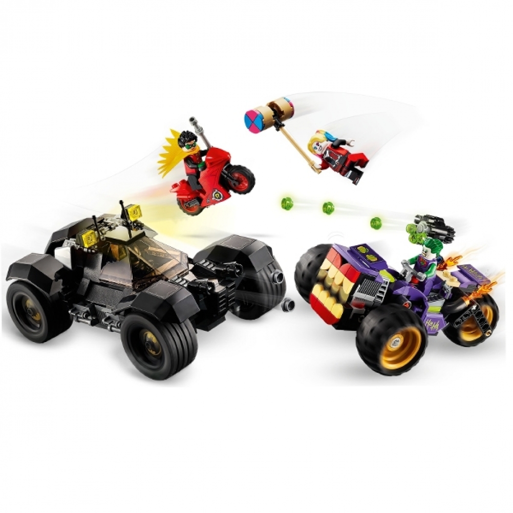 Il mostruoso tre-ruote giocattolo di THE JOKER™, con le sue armi e le fiamme che fuoriescono dal tubo di scappamento, e la mitica Batmobile™ mettono le azioni e le avventure di Batman™ a disposizione dei giovani supereroi che, grazie alle minifigure di Batman™, Robin™, THE JOKER™ e Harley Quinn™, possono iniziare subito a organizzare coinvolgenti giochi di ruolo.