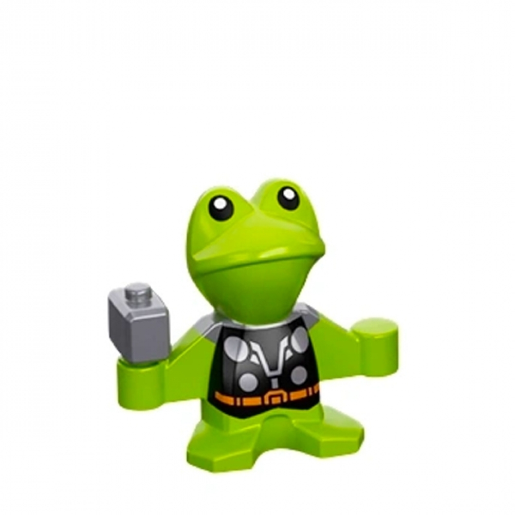 Mini-creatura LEGO Throg – la rana Thor dell’universo Marvel. Raffigurata con martello argentato, torso nero e cintura dorata stampata. Originariamente inclusa come accessorio nella minifigure di Loki (serie Marvel Studios Collectible Minifigures, 2021), ma venduta qui singolarmente. Piccolo pezzo da collezione, perfetto per fan e display.