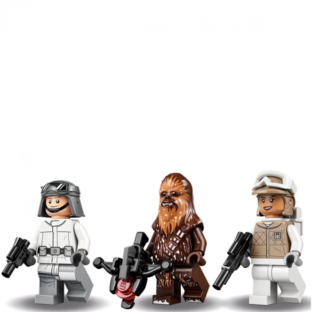 • 3 minifigure LEGO® e un droide: Chewbecca con neve decorativa, un pilota dell'AT-ST di Hoth e un Soldato ribelle di Hoth con rispettive armi e un Droide Sonda imperiale LEGO