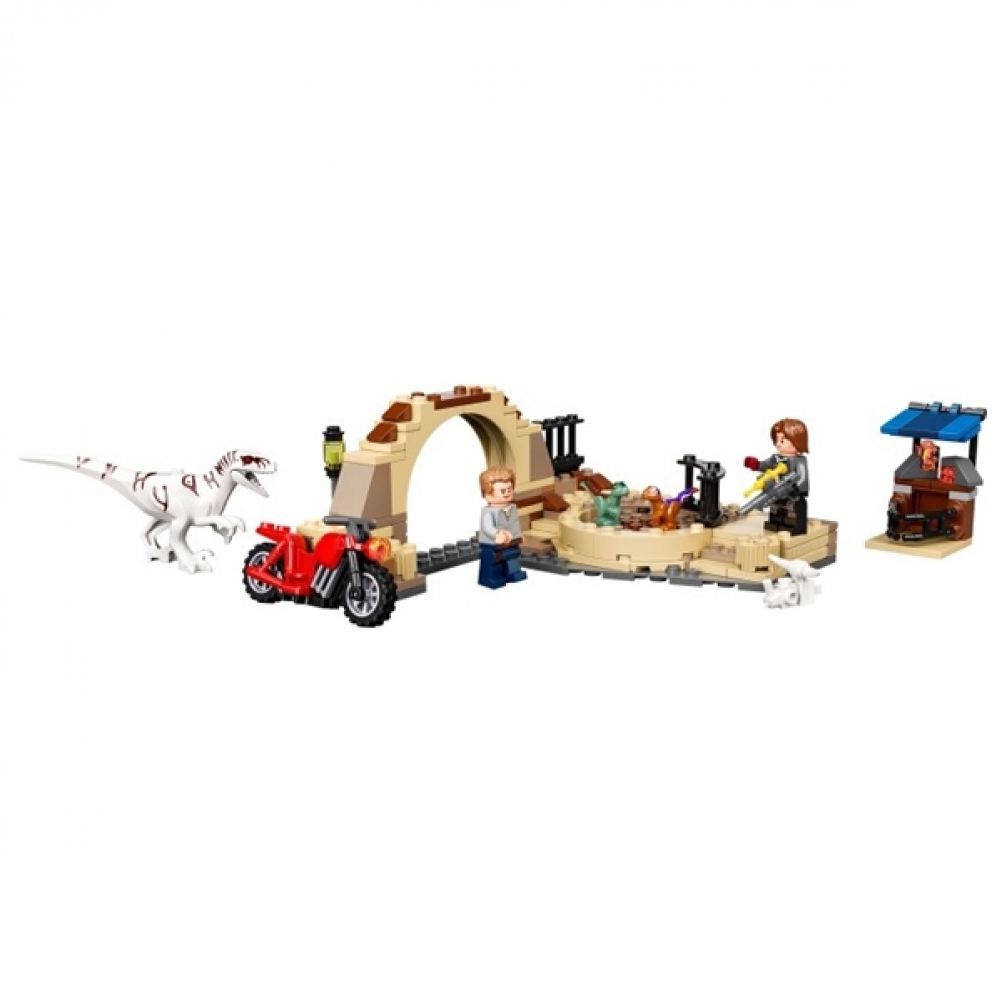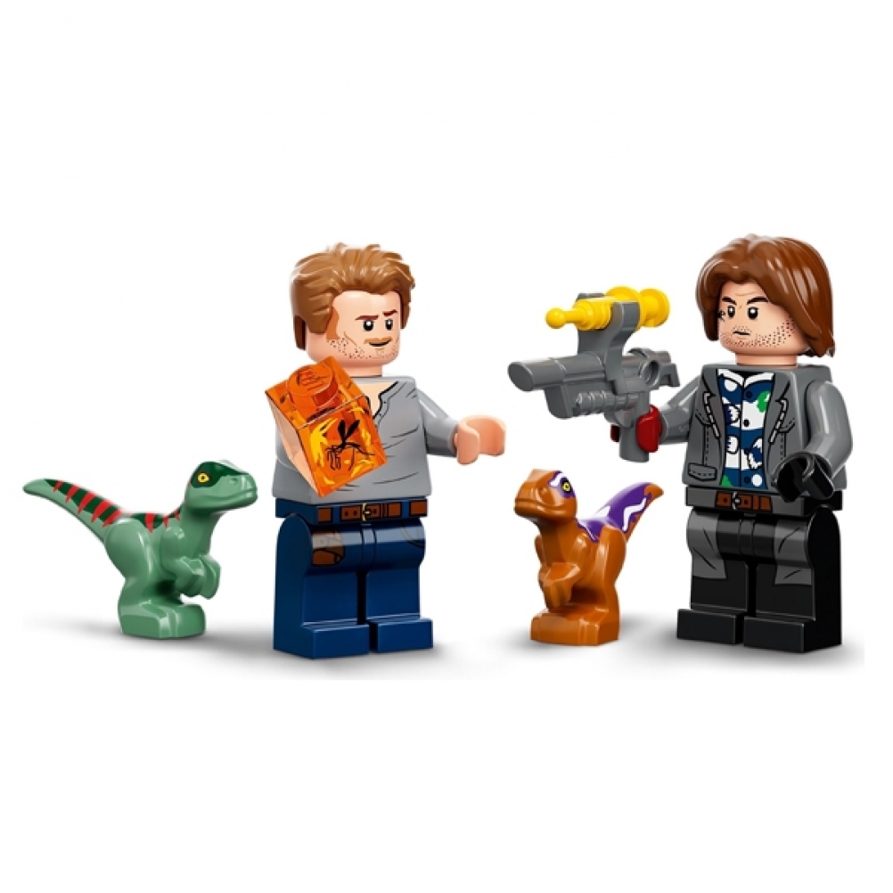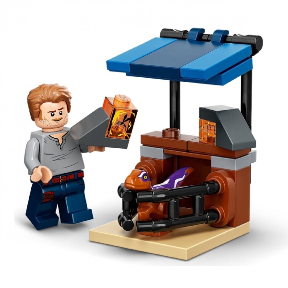 - 2 minifigure LEGO® e dinosauri: Owen Grady e Rainn Delacourt con una pistola tranquillante, più un Atrociraptor snodabile e 2 piccoli dinosauri giocattolo danno vita all’azione nel gioco di ruolo