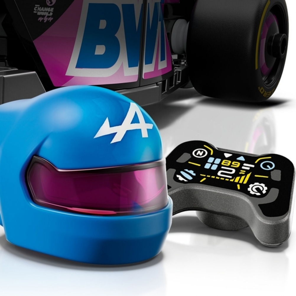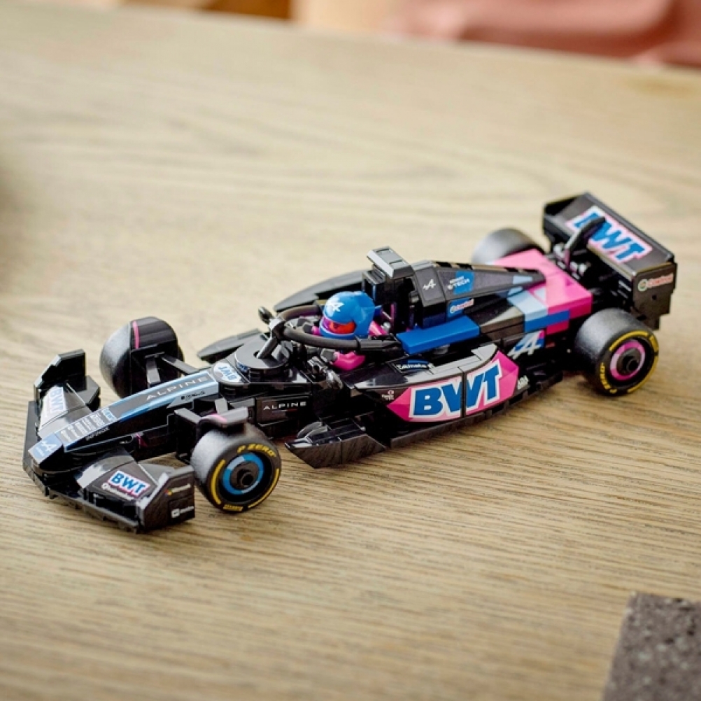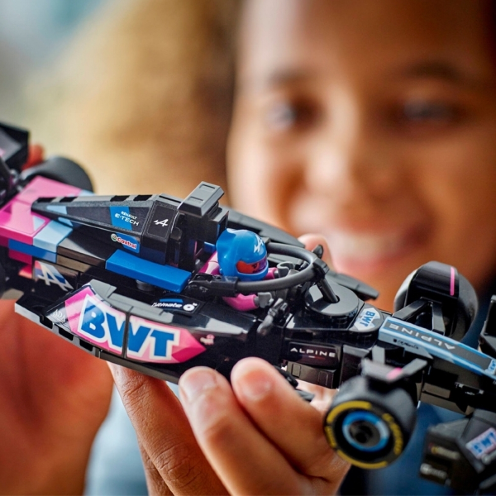 Il modello di auto di F1 è dotato di abitacolo che si apre sollevando la barra d ell’halo, di ala posteriore, sospensioni a quadrilatero, adesivi degli sponsor e pneumatici posteriori più larghi con stampa “Pirelli”. L’auto da corsa contiene anche la minifigure del pilota con tuta Alpine e casco con ala, posizionabile nell’abitacolo.