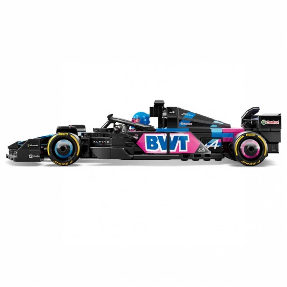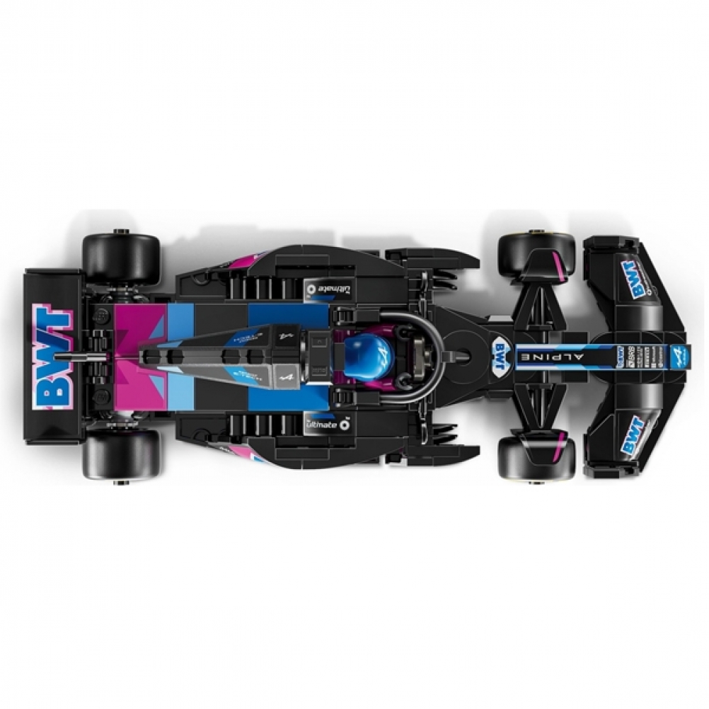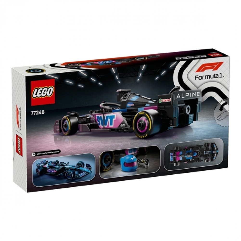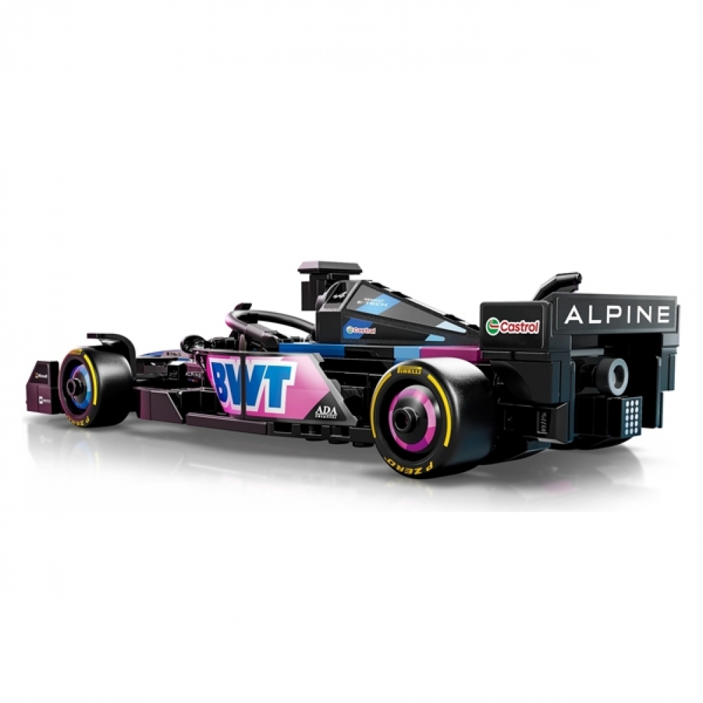 Il modello di auto di F1 è dotato di abitacolo che si apre sollevando la barra d ell’halo, di ala posteriore, sospensioni a quadrilatero, adesivi degli sponsor e pneumatici posteriori più larghi con stampa “Pirelli”. L’auto da corsa contiene anche la minifigure del pilota con tuta Alpine e casco con ala, posizionabile nell’abitacolo.