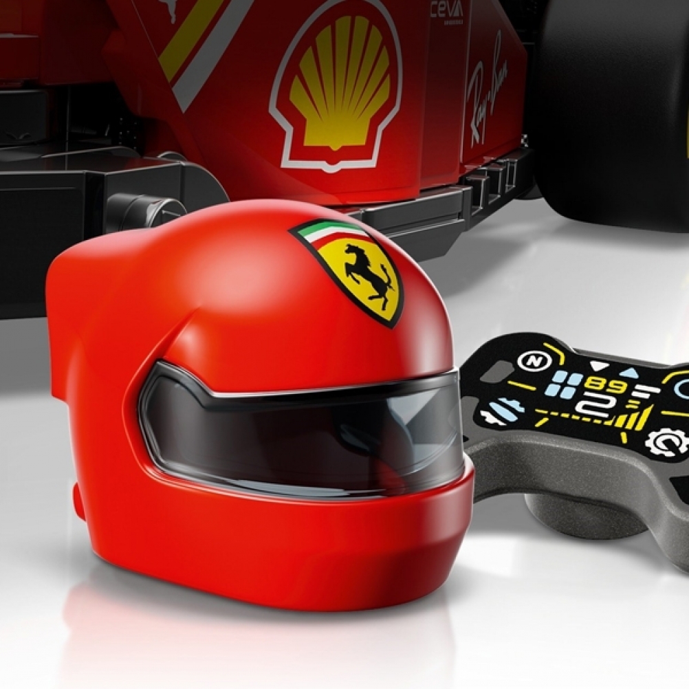 Il modello di auto di F1 è dotato di abitacolo che si apre sollevando la barra dell’halo, di ala posteriore, sospensioni a quadrilatero, adesivi degli sponsor e pneumatici posteriori più larghi con stampa “Pirelli”. L’auto da corsa di F1 contiene anche la minifigure del pilota con tuta Ferrari e casco con ala, posizionabile nell’abitacolo per tante avvincenti gare.