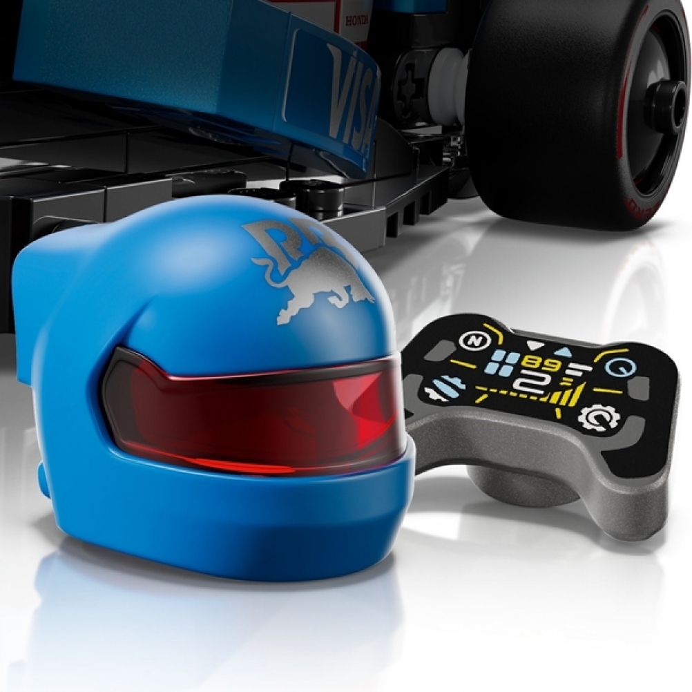 - Minifigure di F1®: il kit del veicolo include una minifigure di un pilota di F1 con tuta RB e casco con ala posizionabile all’interno dell’abitacolo della monoposto di F1