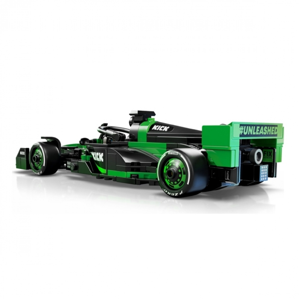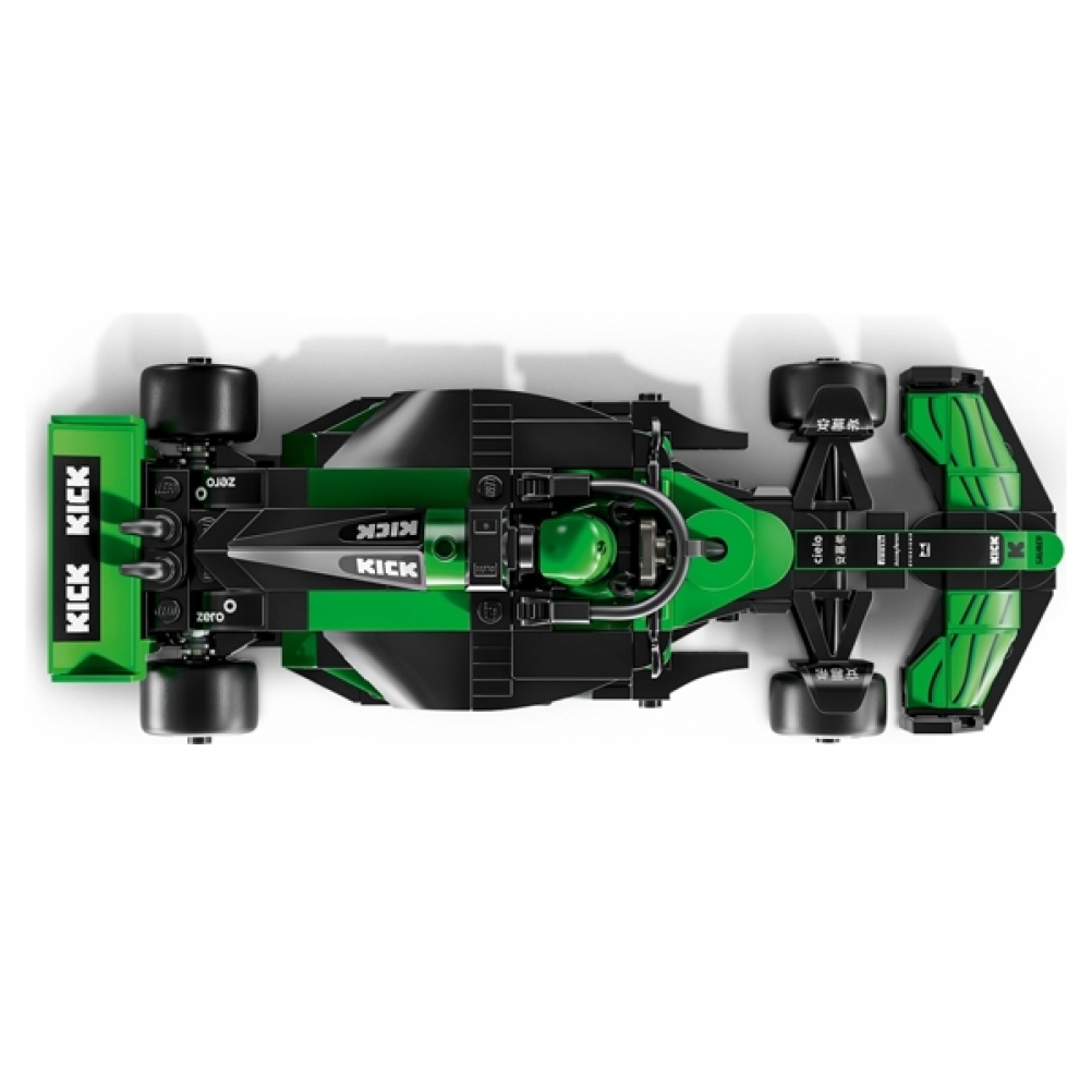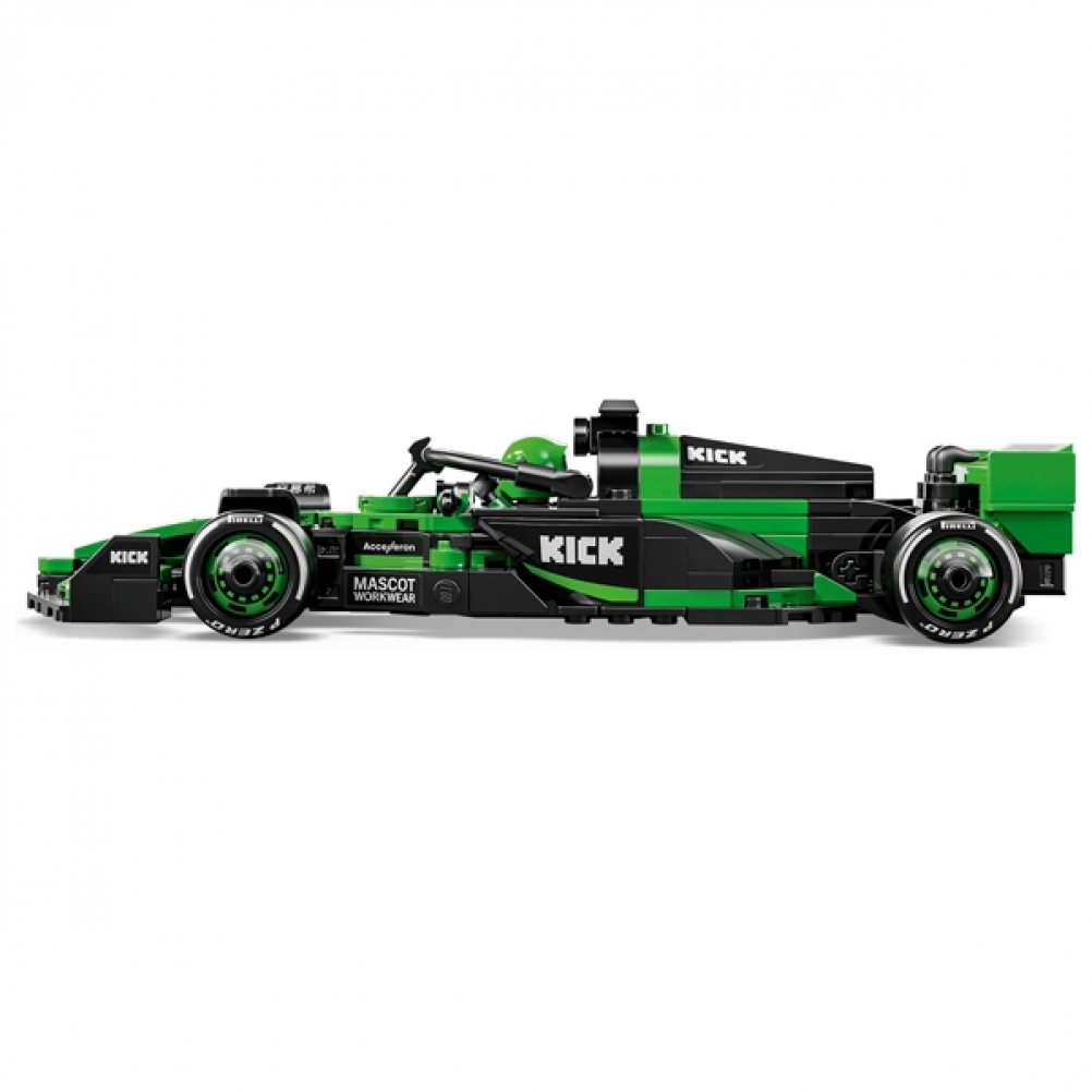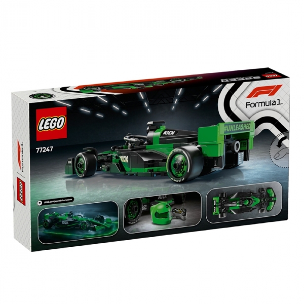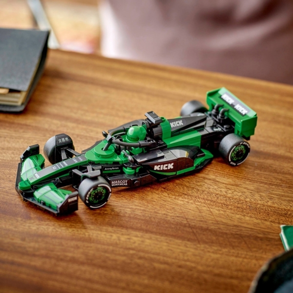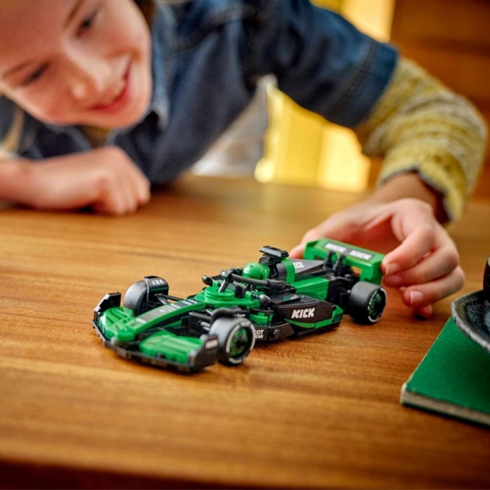 Il giocattolo di auto di F1 è dotato di abitacolo che si apre sollevando la barra dell’halo, di ala posteriore, sospensioni a quadrilatero, adesivi degli sponsor e pneumatici posteriori più larghi con stampa “Pirelli”. L’auto da corsa costruibile contiene anche la minifigure del pilota con tuta Team KICK Sauber F1 e casco con ala, posizionabile nell’abitacolo per tante avvincenti gare.