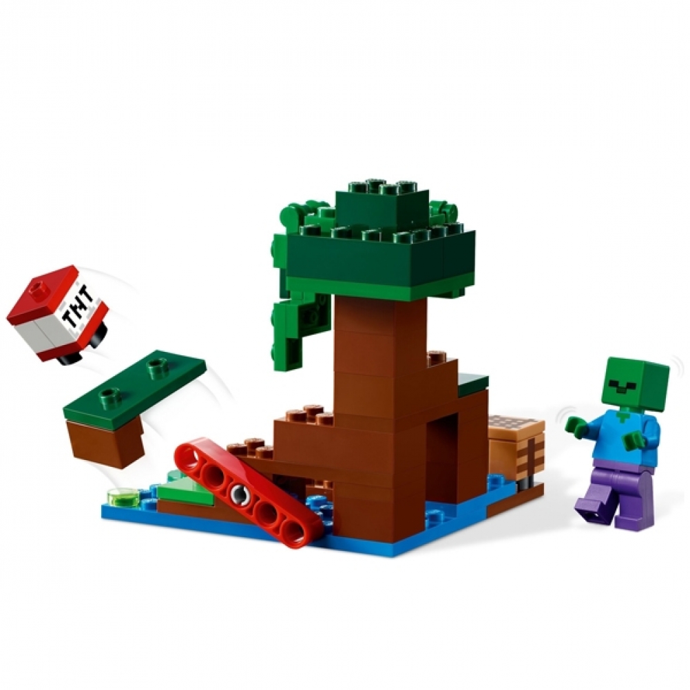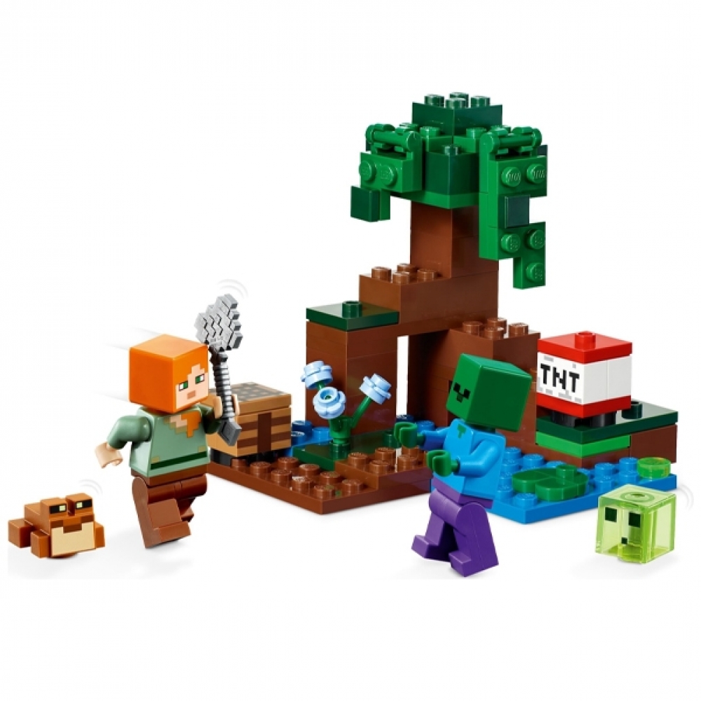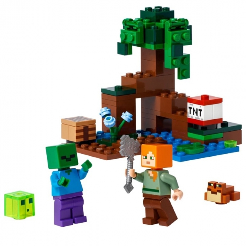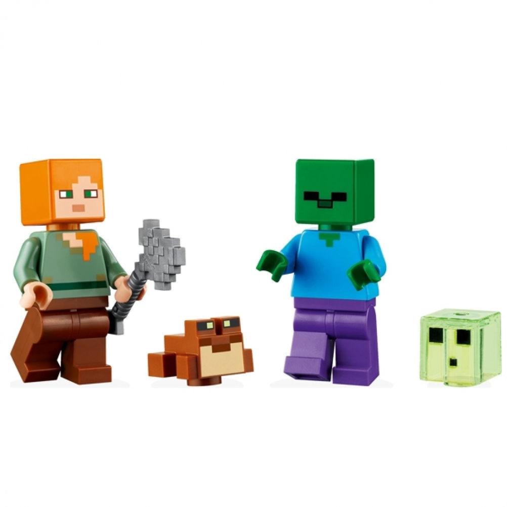 - Personaggi iconici - Include Alex, il famoso personaggio di Minecraft, uno zombie, un Blocco di Slime e una rana, nel bioma completo della palude, un albero di mangrovia, un banco da lavoro, una scure e una funzione per far esplodere la dinamite