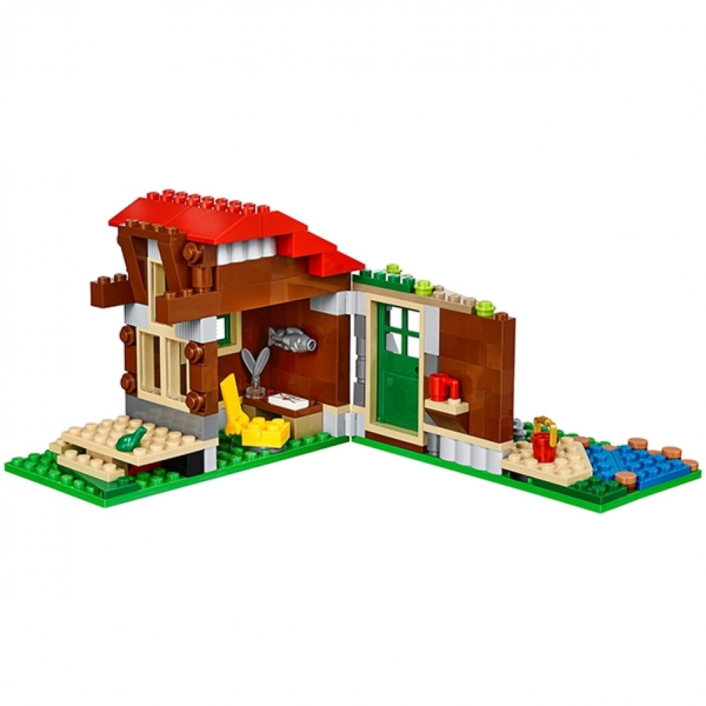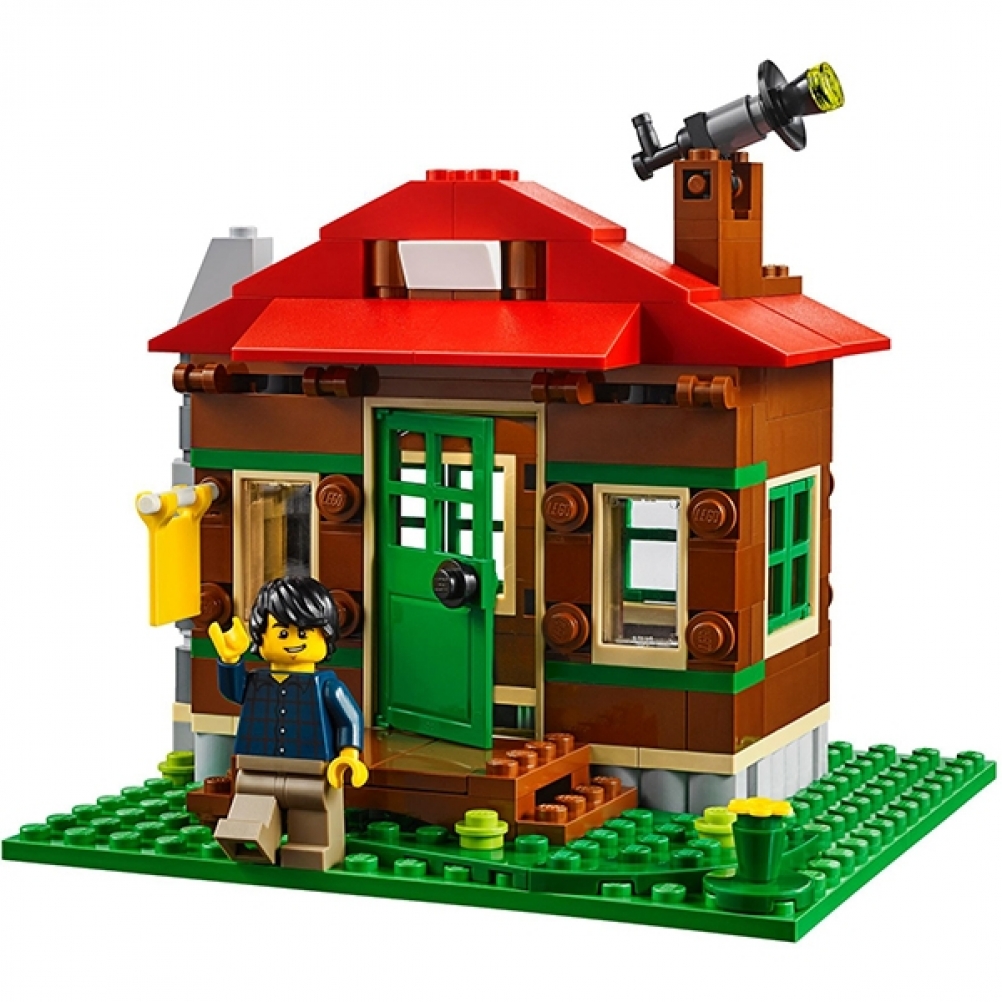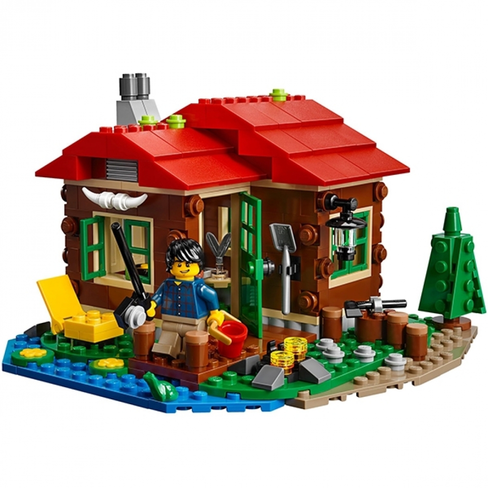 Divertiti alla Baita sul lago con i suoi caratteristici colori rosso, marrone, verde e blu, balcone, lampada da parete, falò, ninfee, area per spaccare la legna e un pino, oltre a un dettagliato interno con stufa, letto e tavolo. Questo modello LEGO® Creator 3-in-1 può essere ricostruito in un osservatorio o piccolo chalet e tutti i modelli possono essere aperti per accedere al loro interno. Include una minifigure di uomo, più un alce e una rana.