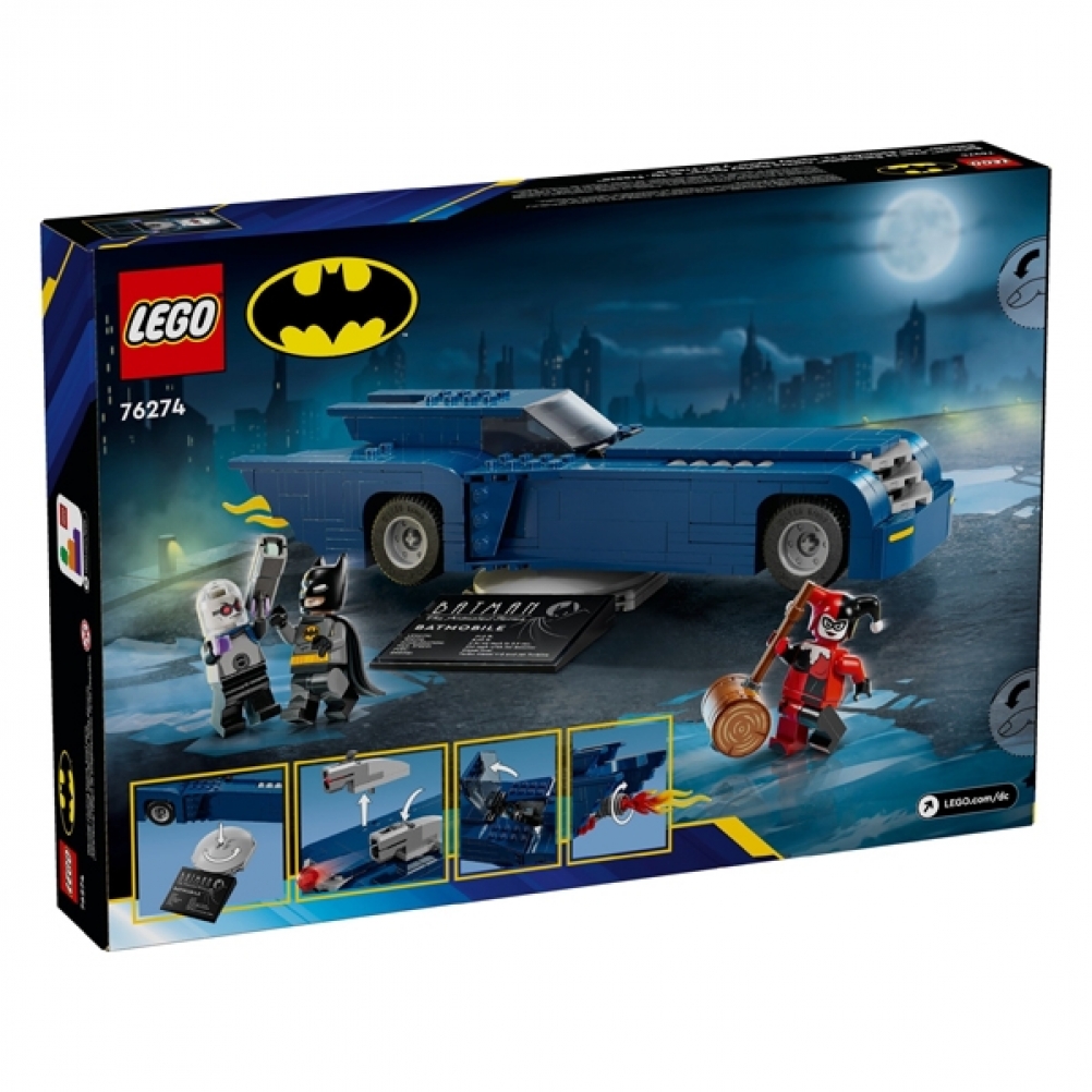 • Set con veicolo LEGO® Batman™: l’auto Batmobile™ push-along include lancia-bottoncini staccabili sul cofano, abitacolo sollevabile, pannello di controllo e un elemento fiamma nello scarico che ruota quando l’auto si muove