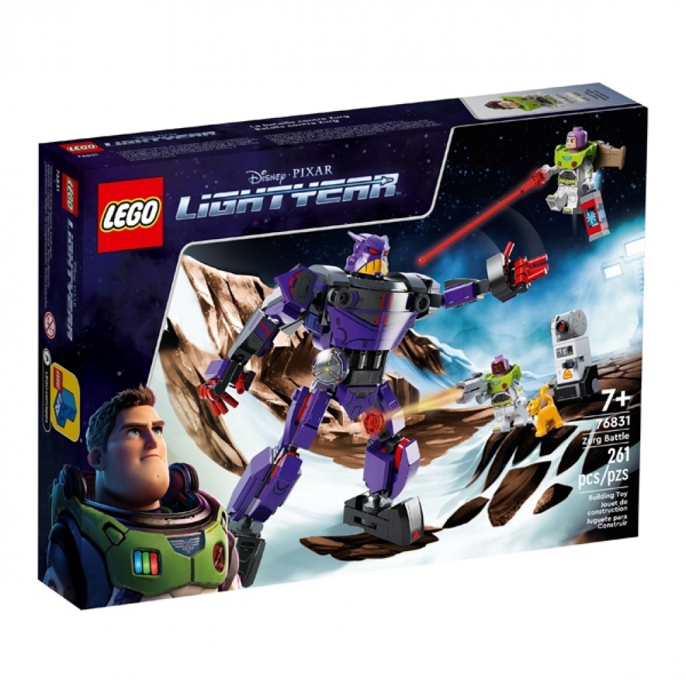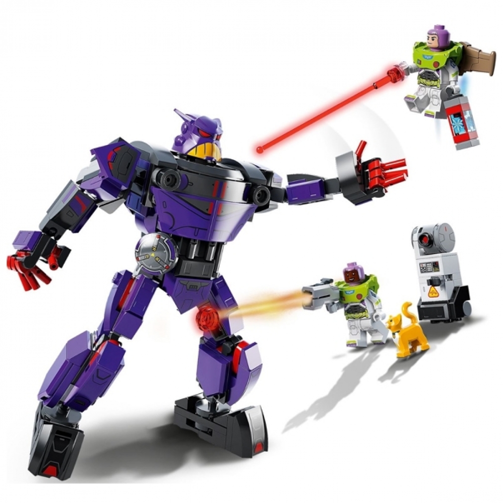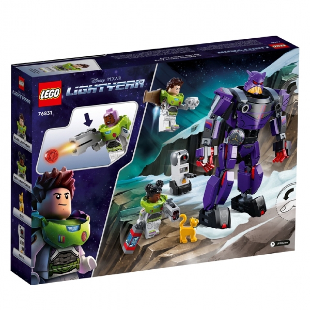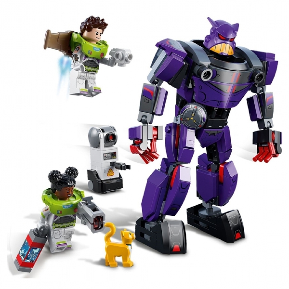 - Personaggi del film: il playset Battaglia di Zurg (76831) è fornito con 2 minifigure, tra cui Buzz Lightyear Disney, un gatto robot LEGO®, un robot costruibile e un mech snodabile