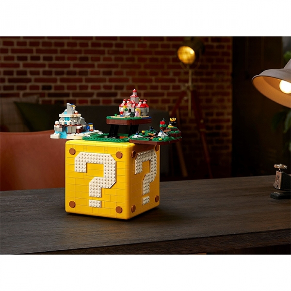 Il Blocco ? misura 18 cm di altezza, larghezza e profondità e si apre per consentire l’accesso a 4 dettagliati livelli di Super Mario 64™: il Castello di Peach, la Battaglia di Bob-omba, il Monte Refrigerio e la Landa di lava.