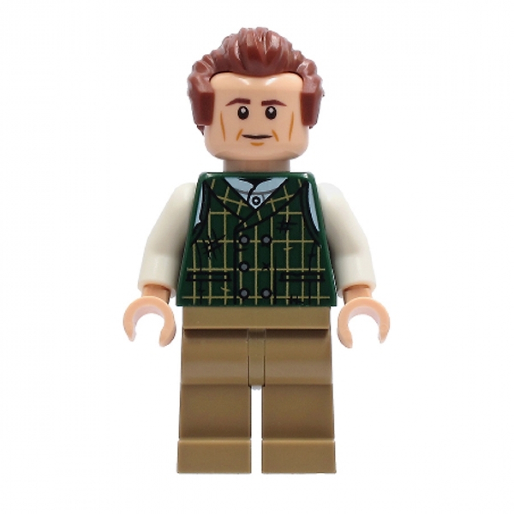 La minifigure di Bob Cratchit, ispirata al classico racconto A Christmas Carol, è vestita con un gilet verde a quadri con dettagli dorati sopra una camicia bianca con colletto e bottoni stampati. Indossa pantaloni marrone chiaro per completare il look. Il viso presenta un'espressione gentile, con leggere rughe che danno un tocco di realismo. Ha capelli castano rossicci, scolpiti con una texture leggermente ondulata. Un design perfetto per rappresentare lo spirito laborioso e generoso di Cratchit nel racconto A Christmas Carol!