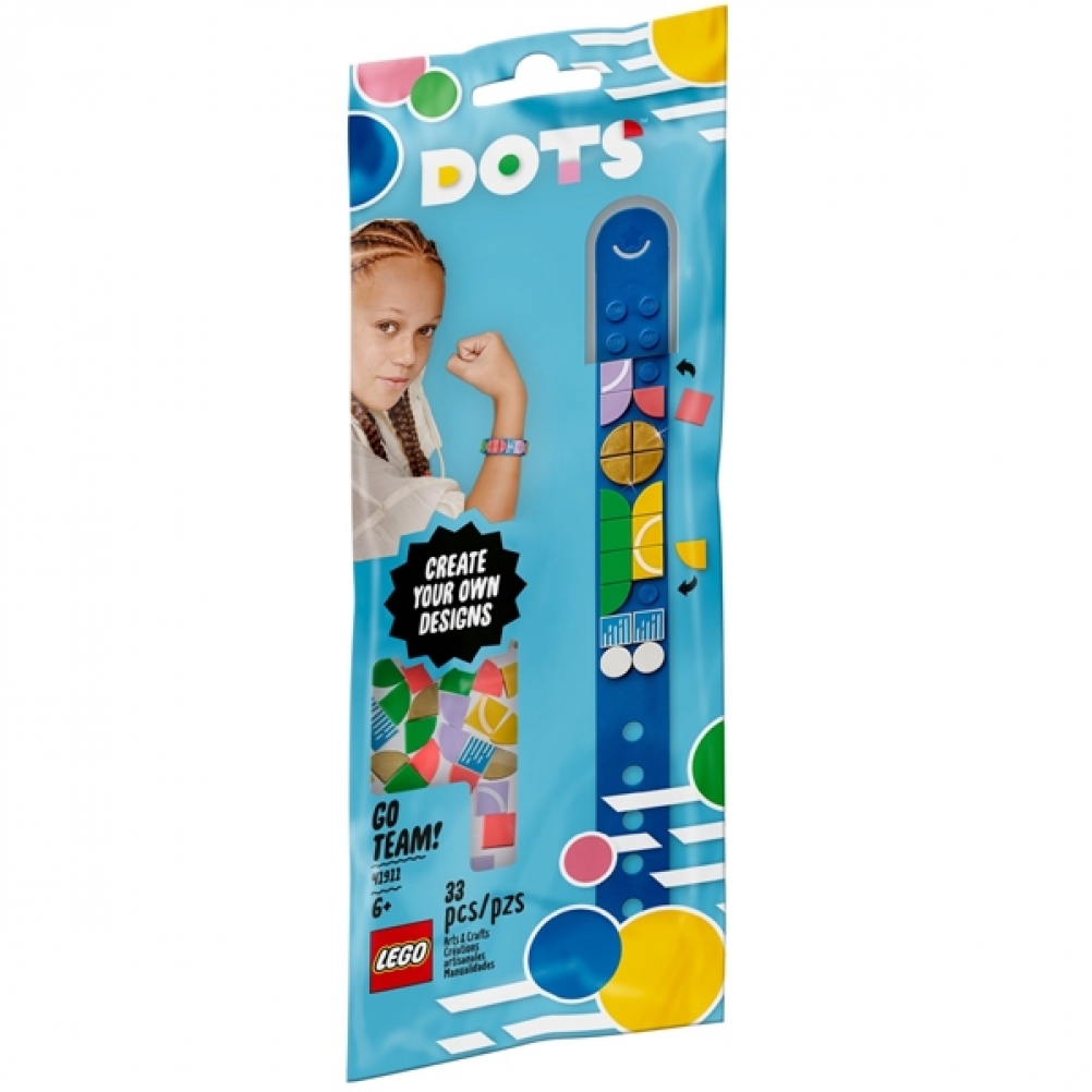 Incoraggia la passione dei bambini per il fai da te creativo con il divertente set Braccialetto Go Team! LEGO® DOTS (41911), che include un braccialetto regolabile e 32 elementi decorativi colorati.