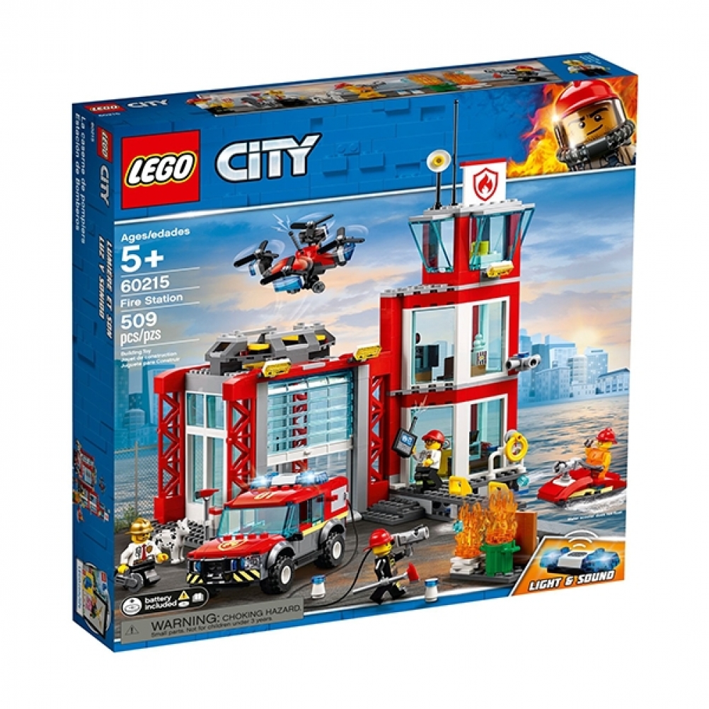 Proteggi i cittadini di LEGO® City con il set Caserma dei Pompieri 60215, contenente una caserma dei vigili del fuoco a 3 livelli con ufficio, sala relax e torre di avvistamento, un piccolo molo e un garage separato con una grande porta d’ingresso e una piattaforma d'atterraggio per il drone staccabile dotato di rotori funzionanti e macchina fotografica. Questo fantastico set contiene anche un fuoristrada antincendio con estintore spara-bottoncini e un mattoncino luminoso e sonoro funzionante - novità di gennaio 2019 - oltre a uno scooter acquatico, 4 minifigure e il cane dei pompieri.
