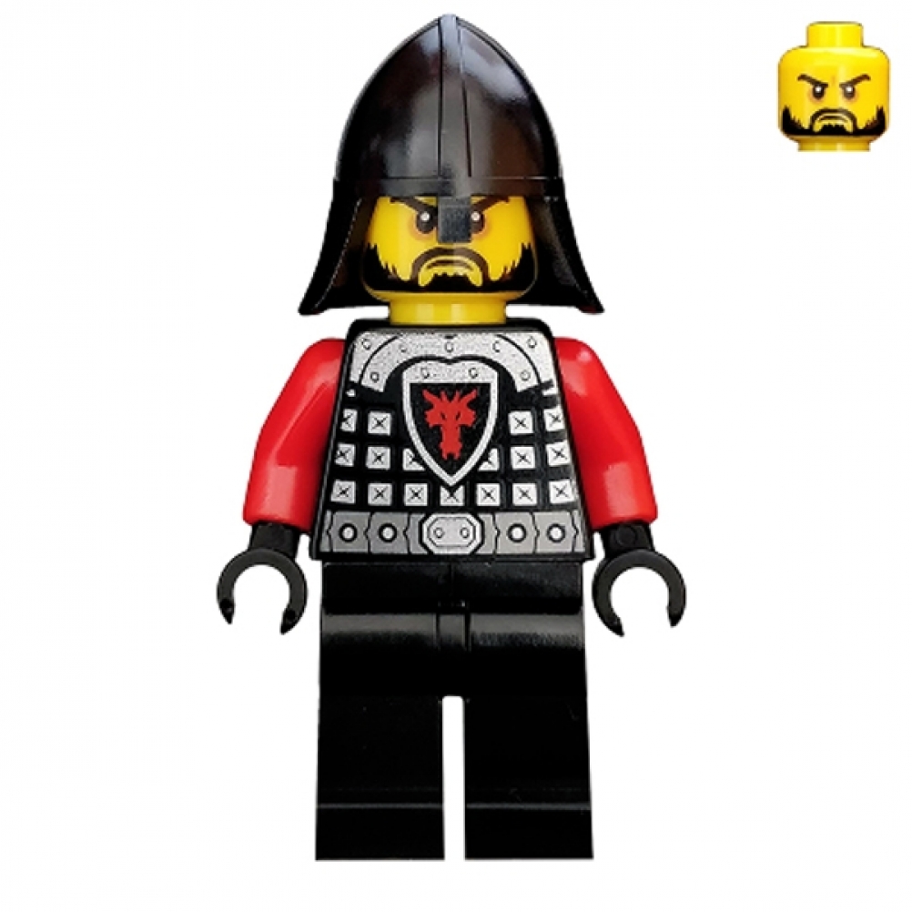 Questa minifigure "Castle - Dragon Knight" indossa una maglia di scaglie con dettagli draconici, accompagnata da uno scudo a forma di drago e protezioni sulle spalle. Il suo elmo è dotato di un protettore per il collo, mentre la barba nera aggiunge un aspetto robusto e imponente. Con la sua armatura intricata e i dettagli draconici, questa minifigure incarna l'aspetto di un cavaliere leggendario pronto alla battaglia.