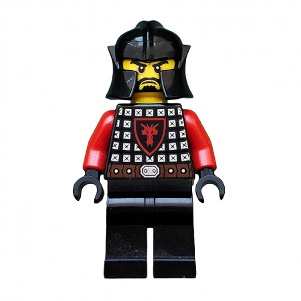 Questa minifigure "Castle - Dragon Knight" è equipaggiata con una maglia di scaglie nera, decorata con un drago sull'armatura e uno scudo a forma di drago, simbolo di forza e potenza. Indossa un elmo con protezione per le guance, che aggiunge un tocco di robustezza al suo aspetto, mentre una folta barba nera gli conferisce un'aria imponente e temibile. Questo cavaliere draconico incarna la forza e la determinazione, pronto ad affrontare ogni battaglia con coraggio.