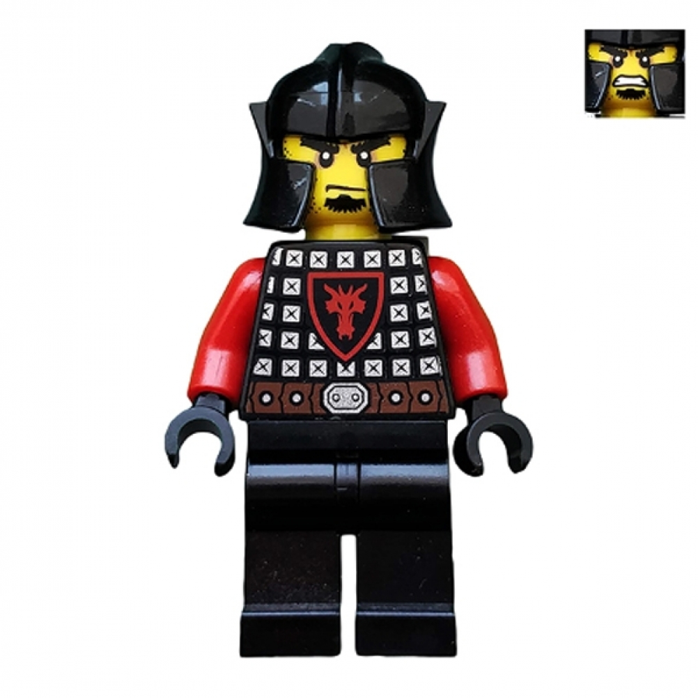 Questa minifigure "Castle - Dragon Knight" è equipaggiata con una maglia di scaglie nera, decorata con un imponente scudo a forma di drago. Indossa un elmo con protezione per le guance, che aggiunge un ulteriore strato di difesa e stile. Le sue sopracciglia folte conferiscono un aspetto deciso e potente, perfetto per un cavaliere draconico pronto alla battaglia.