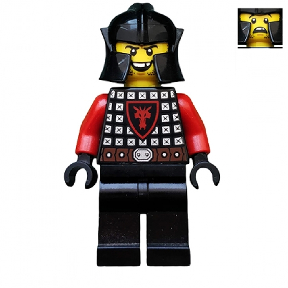 Questa minifigure "Castle - Dragon Knight" è equipaggiata con una maglia di scaglie nera, impreziosita da uno scudo a forma di drago, simbolo di potenza. Indossa un elmo con protezione per le guance, che aggiunge un tocco di solidità e protezione. Il cavaliere sfoggia un sorriso aperto, con un dente mancante, che gli conferisce un aspetto audace e coraggioso, come se fosse un veterano di battaglie. Un personaggio che unisce forza, carattere e un po' di grinta, pronto a combattere per il suo regno.