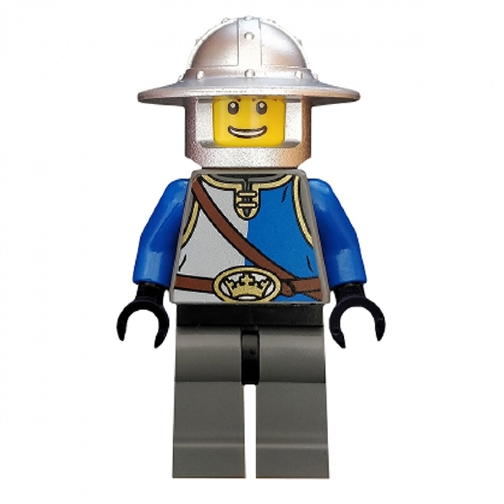 Questa minifigure "Castle - King's Knight" indossa un'armatura blu e bianca, con una cintura decorata da una corona e una cinghia sul petto, che ne esaltano l'aspetto nobile e distintivo. Il suo elmo ha una larga visiera e un ampio bordo, mentre il volto è sorridente con un'espressione aperta e amichevole. Questa minifigure incarna un cavaliere regale e coraggioso, pronto a combattere per il suo re con grinta e determinazione.