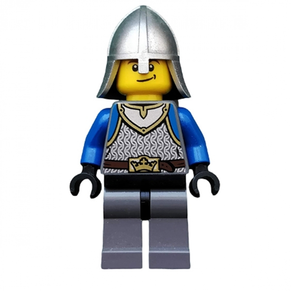 La minifigure di Castle - King's Knight presenta un'armatura a maglia di scaglie, con una cintura decorata da una corona e un elmo dotato di protezione per il collo. Il suo sorriso furbo e sicuro di sé completa il look da cavaliere, pronto a difendere il regno con determinazione e nobiltà.