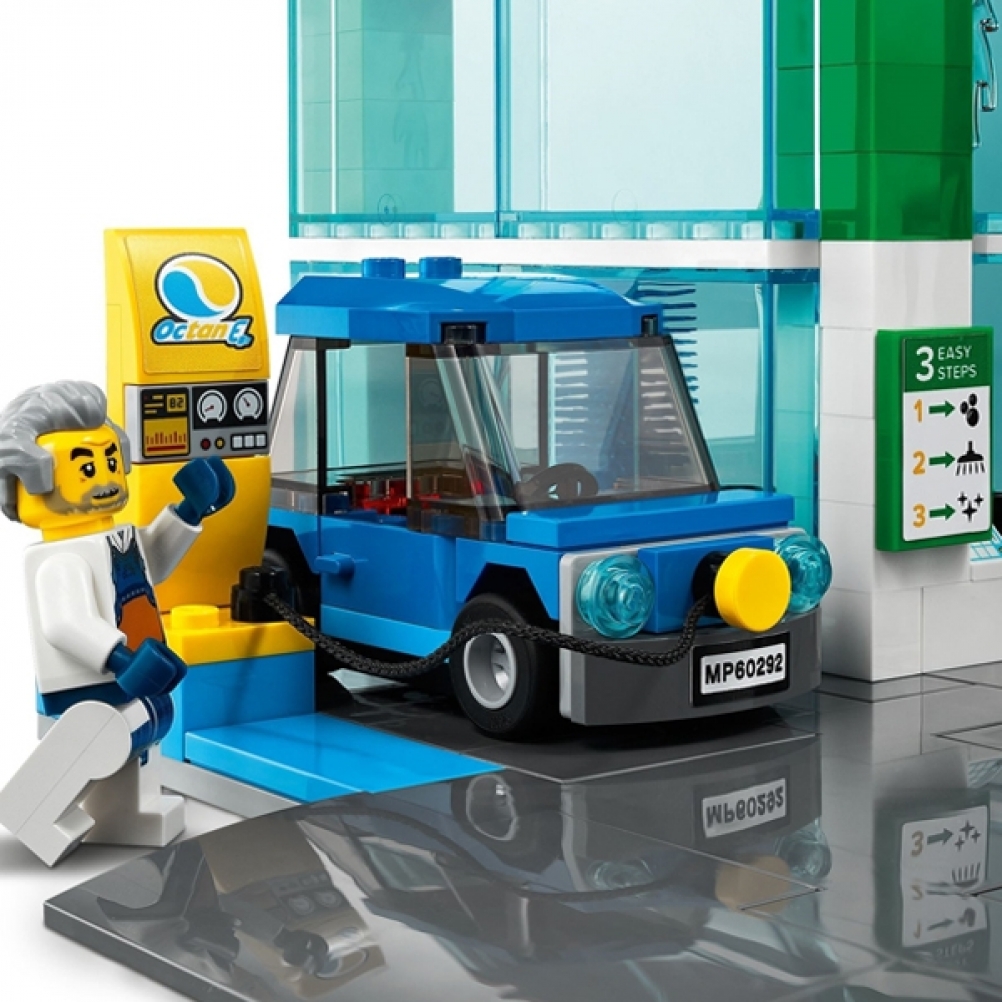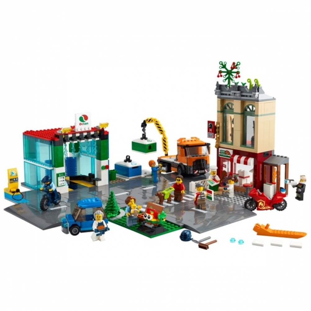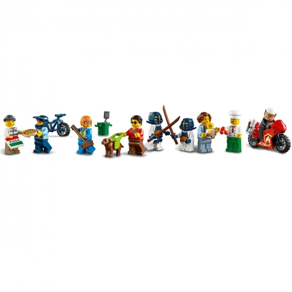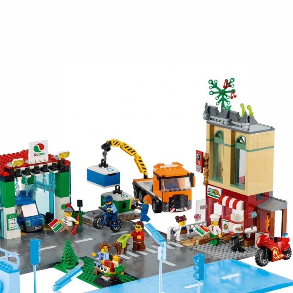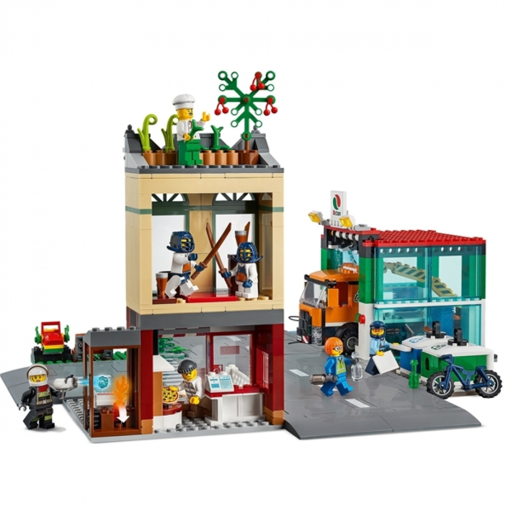 Include: pizzeria, isola ecologica, autolavaggio, stazione di ricarica per veicoli elettrici, dojo per arti marziali e parco con giostra, oltre alle minifigure dei personaggi di LEGO City.