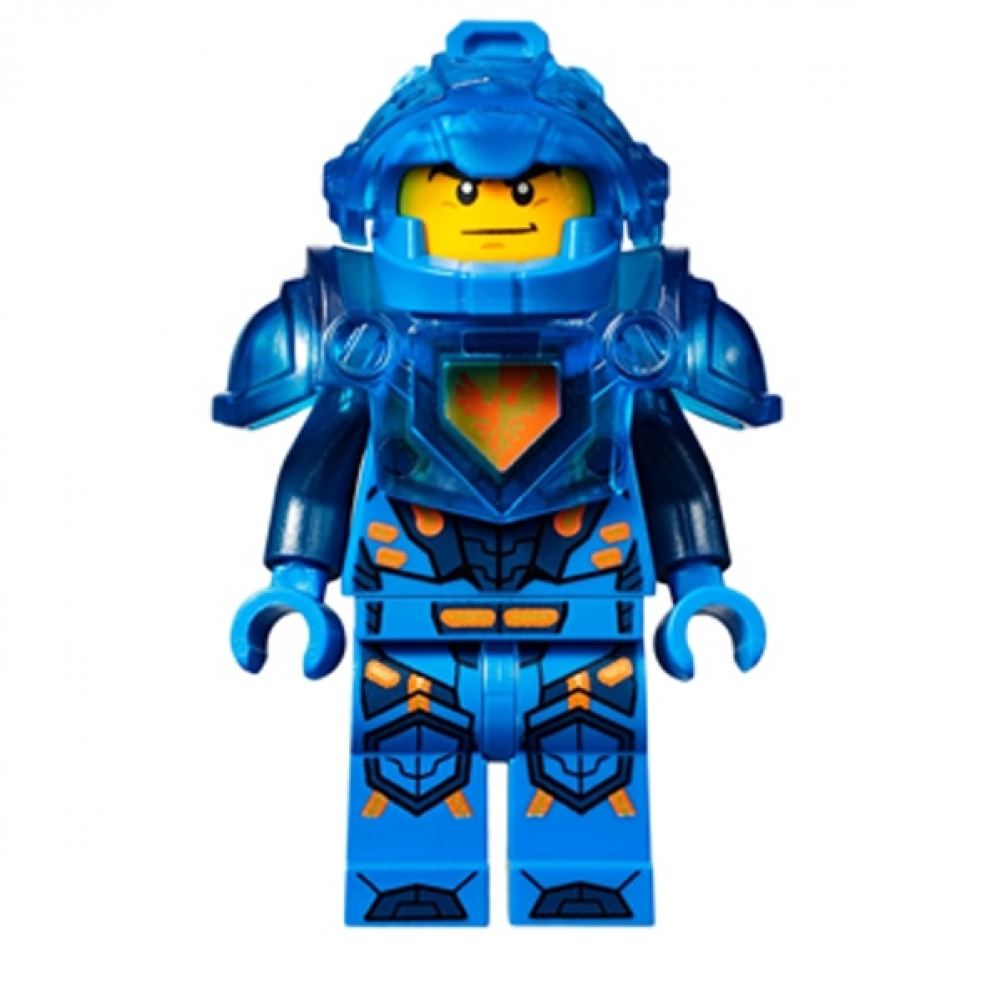 La minifigure Clay Moorington in versione Ultimate Clay sfoggia un elmo blu con visiera trasparente di un blu scuro, abbinato a un'armatura altrettanto elegante e resistente. Il suo look, audace e raffinato, è pensato per affrontare ogni sfida con determinazione. Con il suo stile da cavaliere futuristico, Clay è pronto a proteggere il regno di Nexo Knights, combinando tradizione e tecnologia in un'armatura all'avanguardia. Un vero leader, pronto a difendere la giustizia con coraggio e abilità.