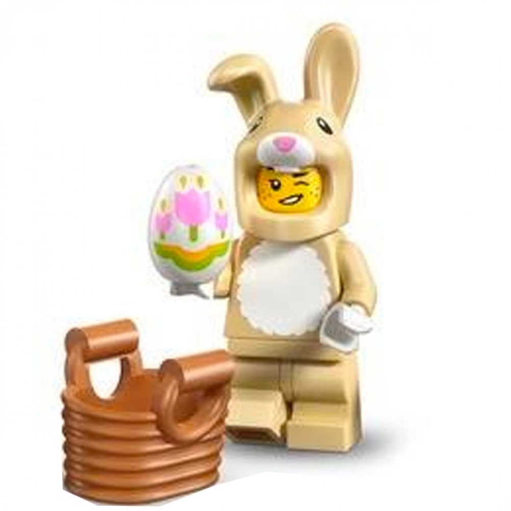 Un grande classico: il costume da coniglio con cestino e uovo di Pasqua, perfetto per celebrare la primavera in stile LEGO!