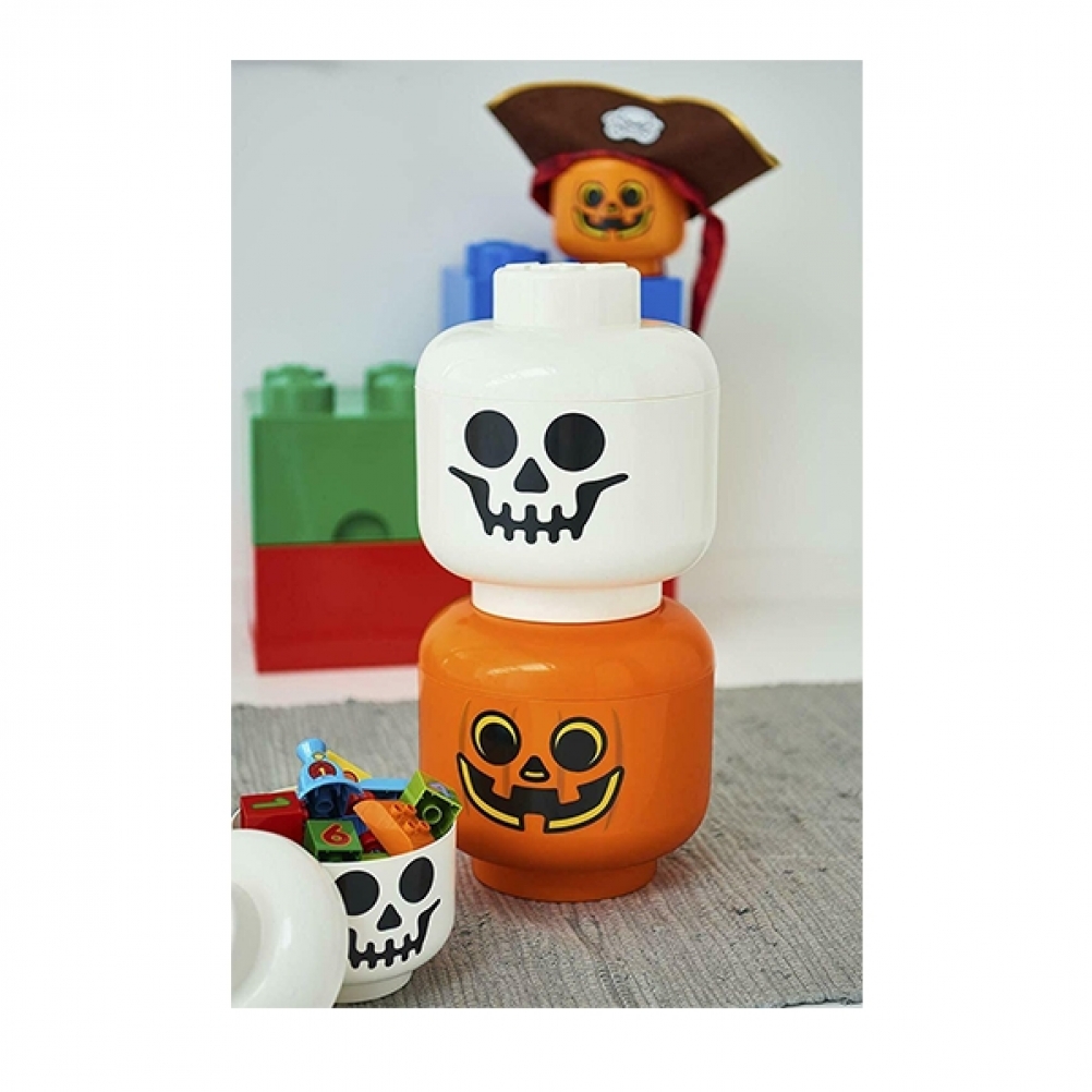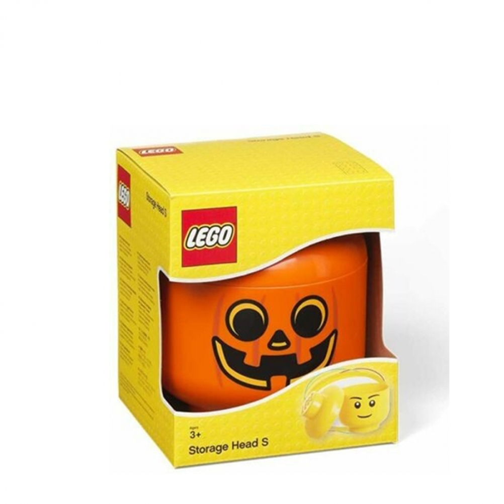 Testa portaoggetti impilabile su scala in resistente polipropilene con caratteristiche facciali della minifigure zucca di halloween LEGO®.
