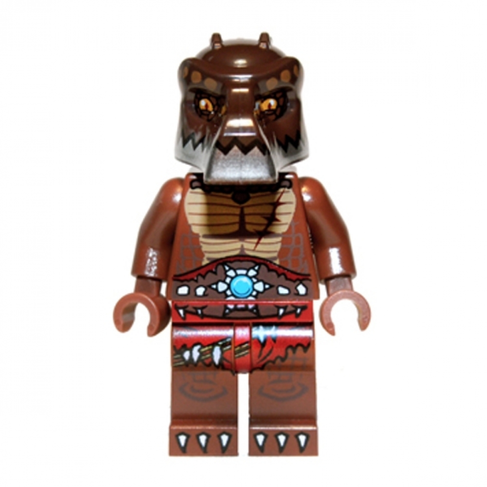 Minifigure originale LEGO appartenente alla serie Legends of Chima, personaggio Crug, membro della Tribù dei Coccodrilli. Corpo dettagliato con torso muscoloso e decorazioni tipiche della serie, in toni marroni e blu turchese.