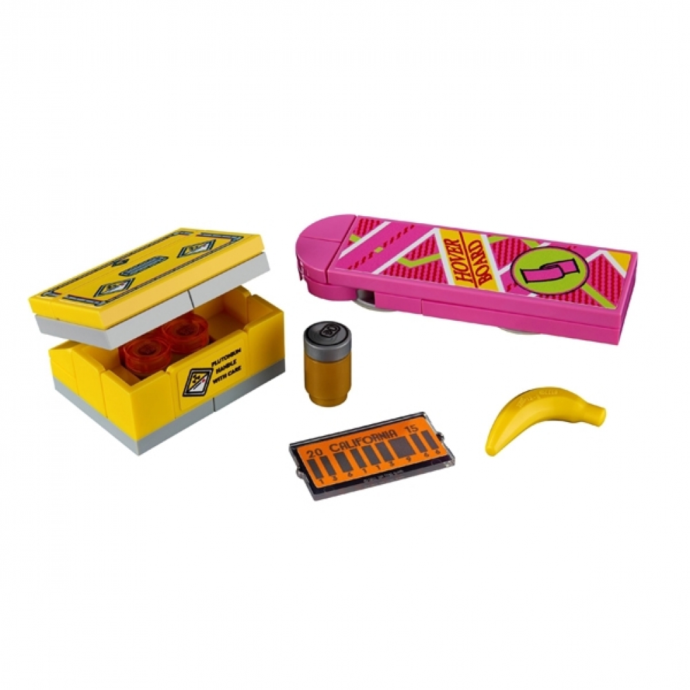 - Include 2 minifigure e accessori: individua i dettagli dei film, come l’hoverboard di Marty e la targa OUTATIME. Il set è fornito con le minifigure di Doc e Marty McFly da aggiungere al modello da esporre