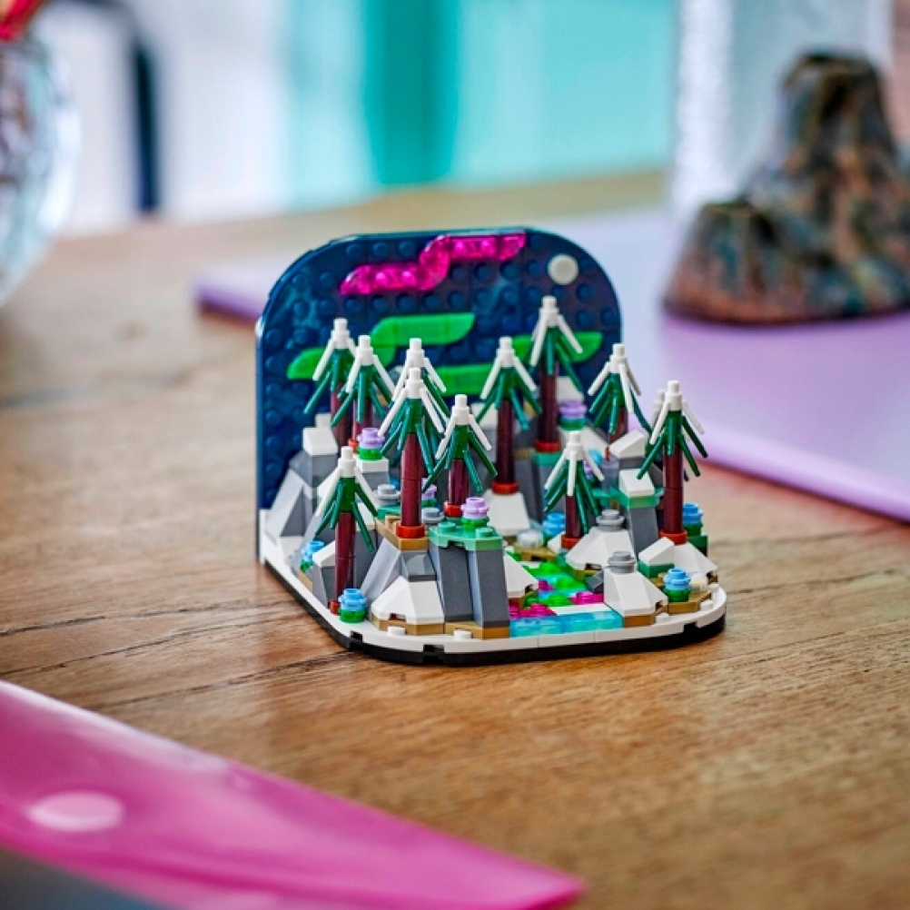 - Kit diorama dell’aurora boreale: questo modellino del Diorama Aurora Boreale LEGO® raffigura un paesaggio forestale dell’emisfero settentrionale completo di alberi di un cielo notturno illuminato dall’aurora boreale.