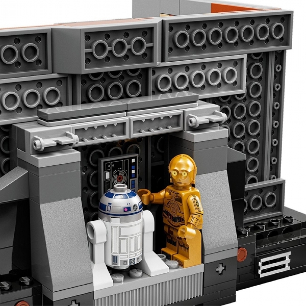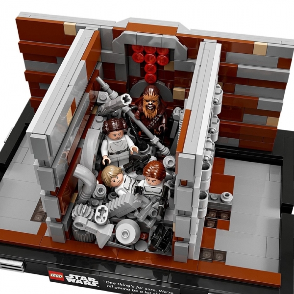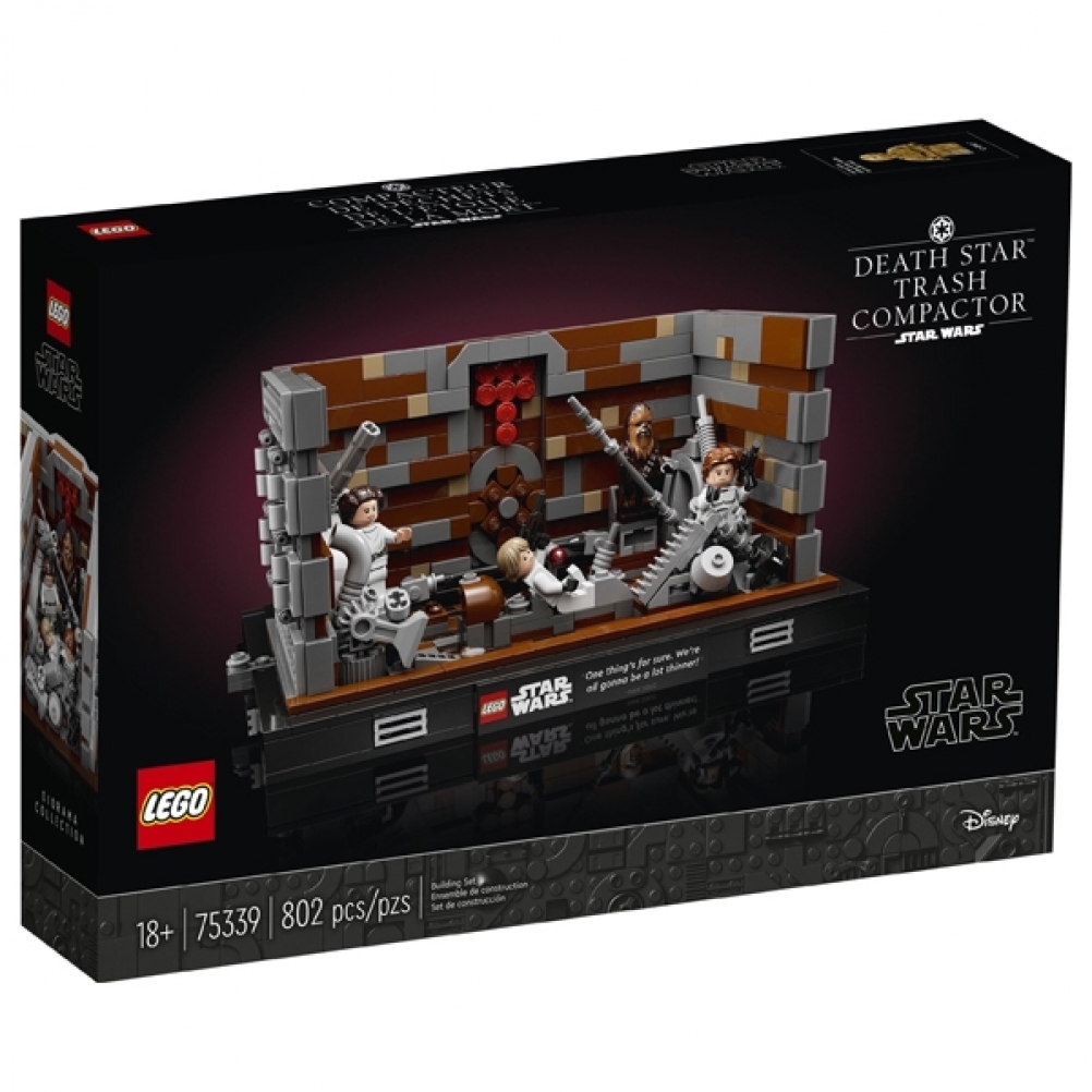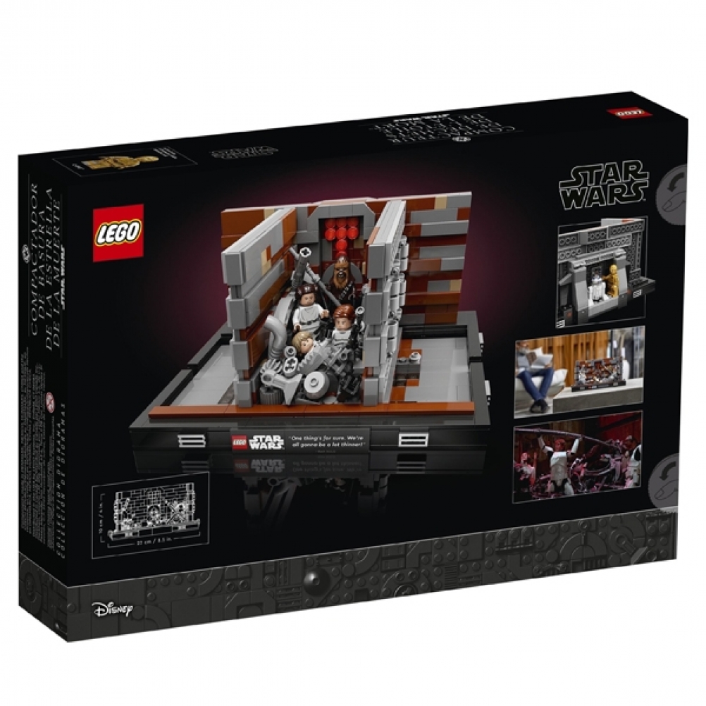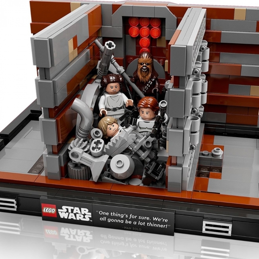 • Dettagli autentici: il set include pareti mobili, la testa di un Dianoga, il pannello di controllo del compattatore di rifiuti e una targhetta con la celebre battuta di Han Solo “Una cosa è sicura. Diventeremo tutti magrissimi”