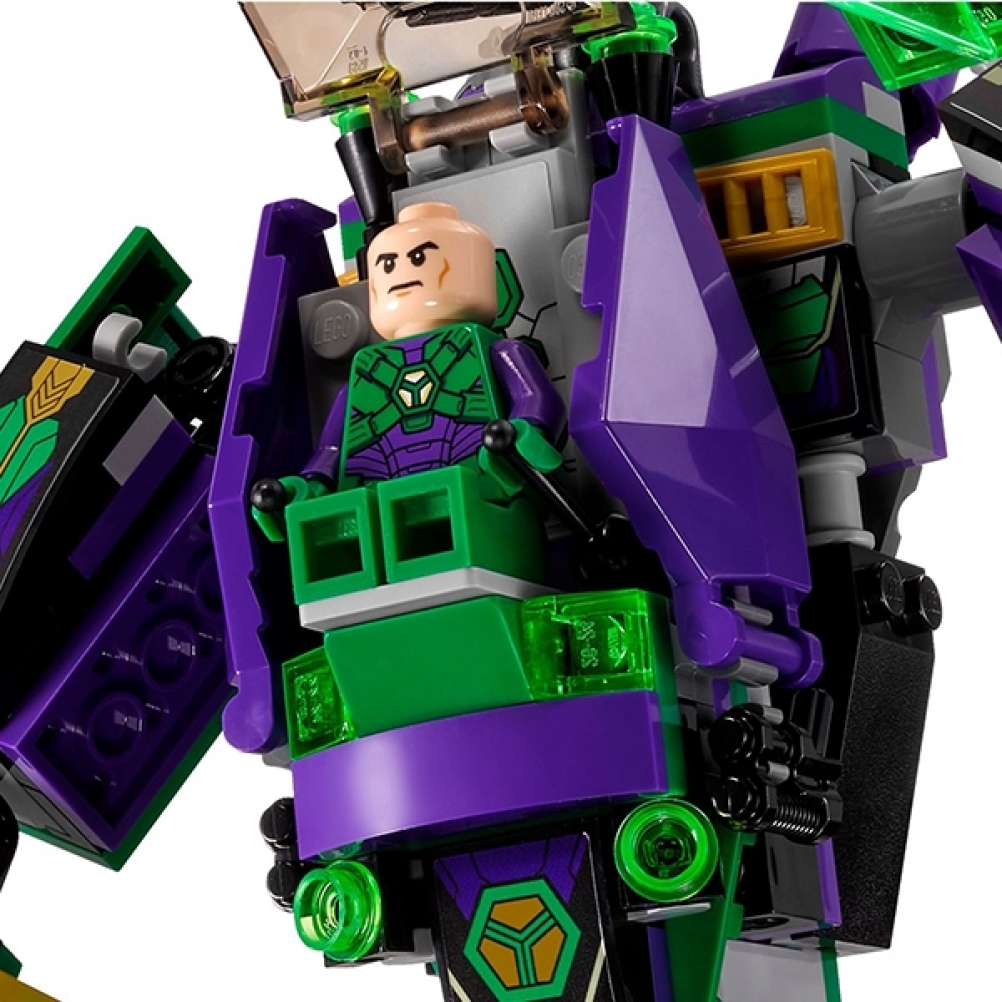 • Il robot di Lex Luthor™ è dotato gambe, braccia e dita snodabili, shooter a fuoco rapido a 6 colpi regolabile, ascia costruibile, punti di attacco per 3 Infusori di energia collezionabili e un punto di attacco per la prigione di Kryptonite contenuta nel set 76096 L'allenza tra Superman™ e Krypto™.