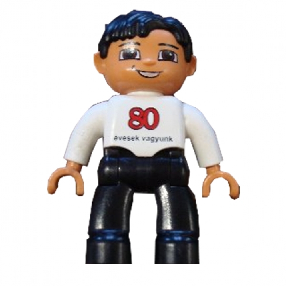 Duplo Figure Lego Ville, maschio, gambe nere, top bianco, capelli neri, '80 evesek vagyunk 'sul davanti, logo LEGO sul retro
