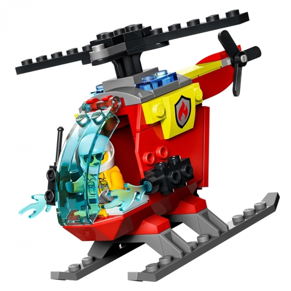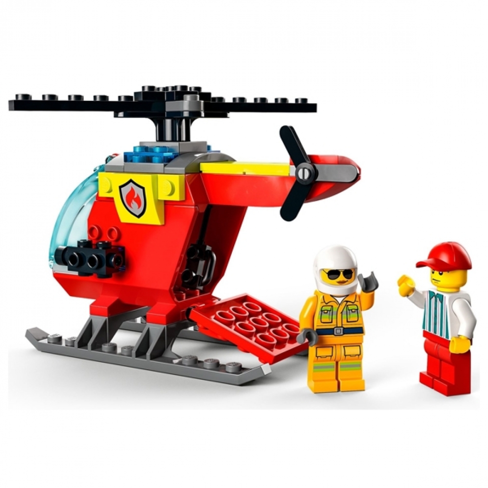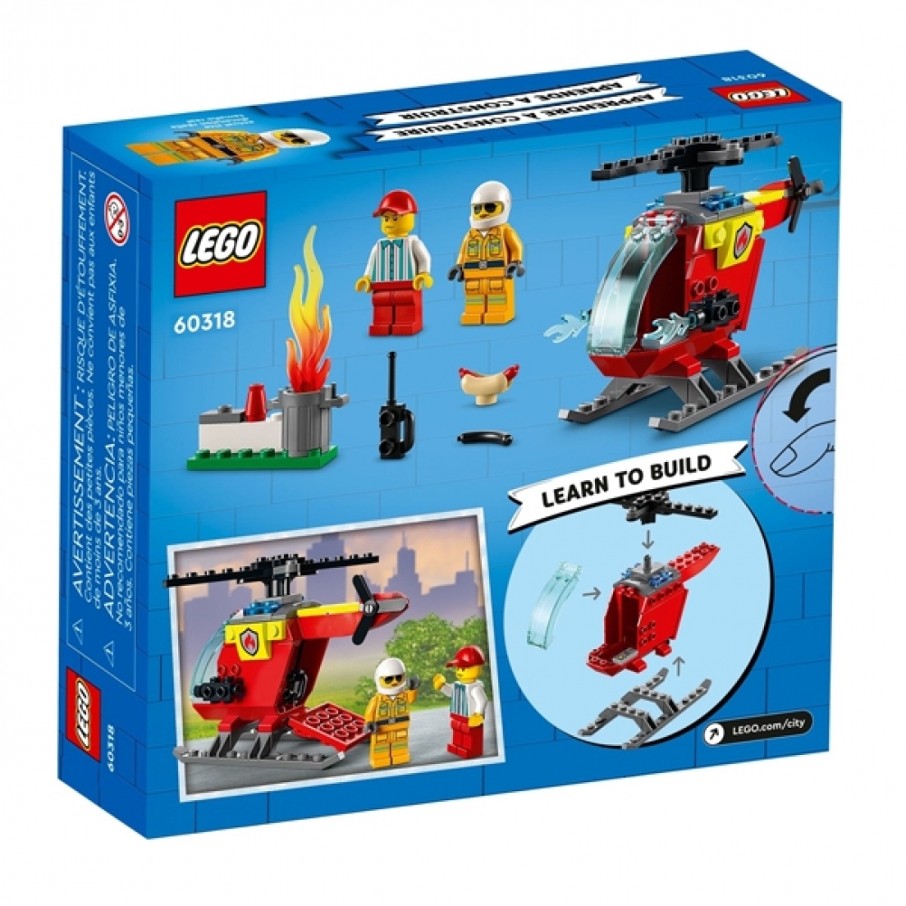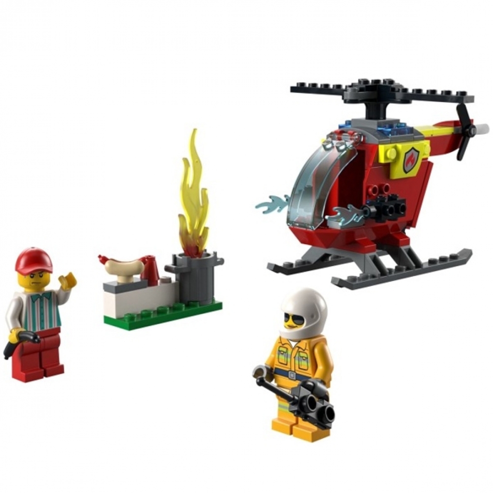 - Cosa c'è nella scatola? Tutto il necessario per costruire un elicottero antincendio giocattolo, oltre alle minifigure di un pompiere e di un venditore, un bidone della spazzatura con fiamme LEGO® e divertenti accessori, tra cui un hotdog bruciato