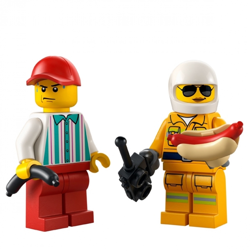 - Accessori LEGO® da aggiungere al gioco: tra gli accessori della minifigure sono inclusi un hotdog, un hotdog bruciato, un panino per hotdog, un walkie-talkie e un casco da pilota