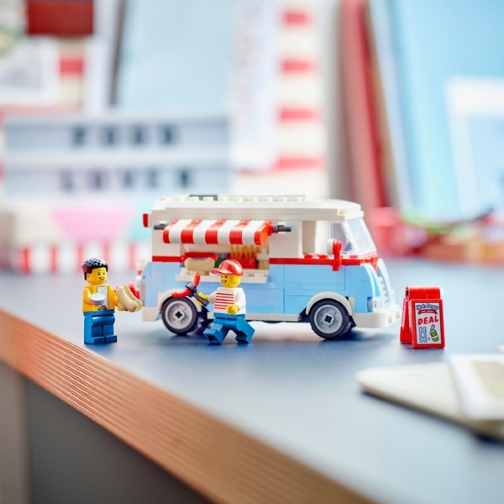 - Cosa c’è nella scatola: tuttociò di cui hai bisogno per costruire un camion fast food di metà secolo con tenda, cartello del menu, vassoio per condimenti pieghevole, 2 minifigure e accessori alimentari tra cui patatine fritte e un hot dog