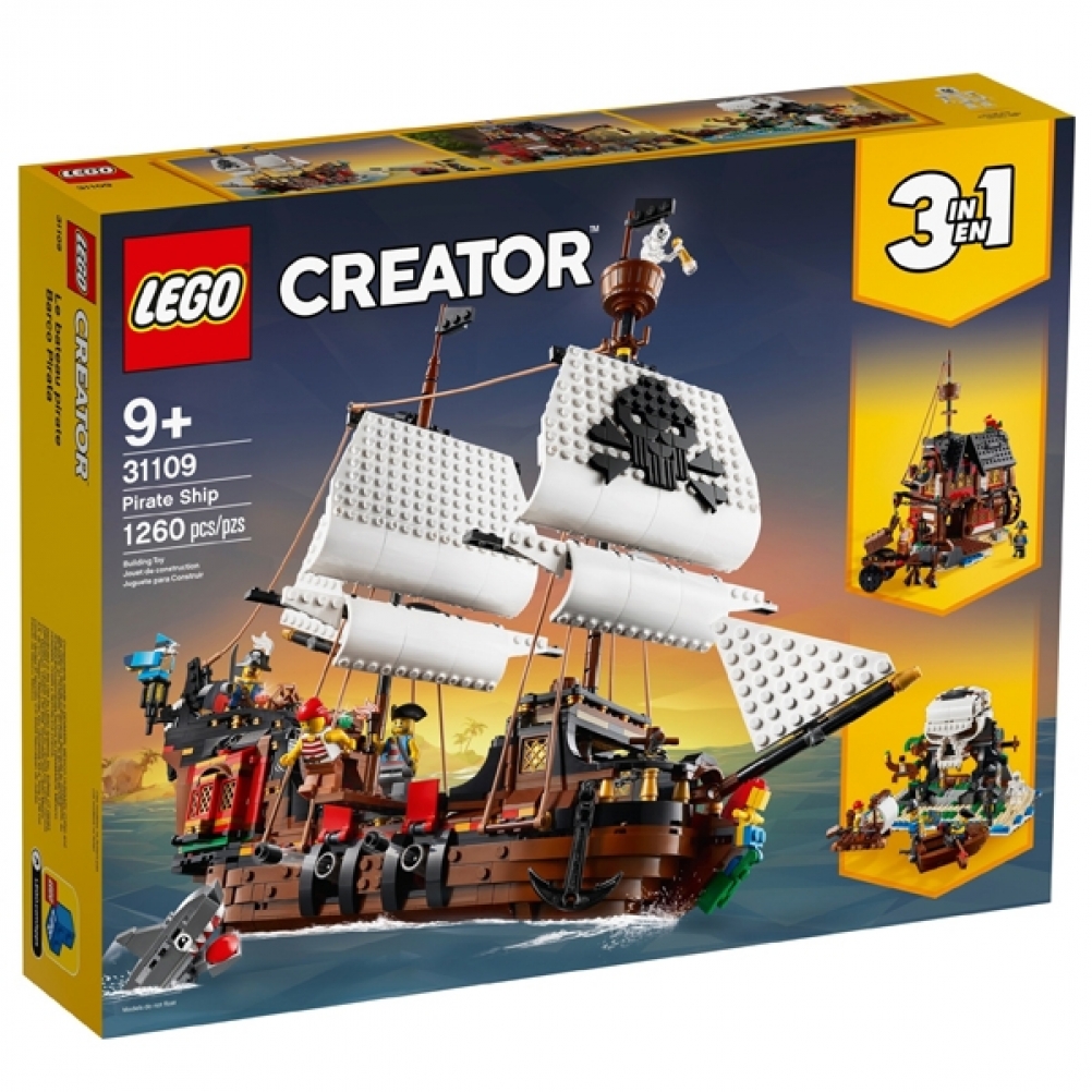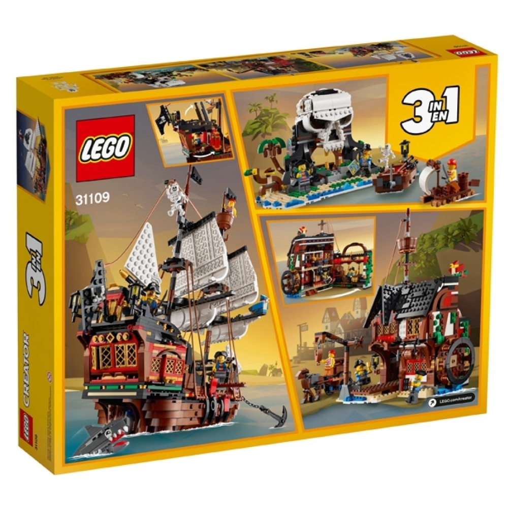 Il set LEGO® Creator 3 in 1 Galeone dei pirati (31109) stimola il gioco creativo nei bambini offrendo loro 3 modelli in 1: un classico Galeone dei pirati, una rustica Taverna dei pirati e una misteriosa Isola del teschio.