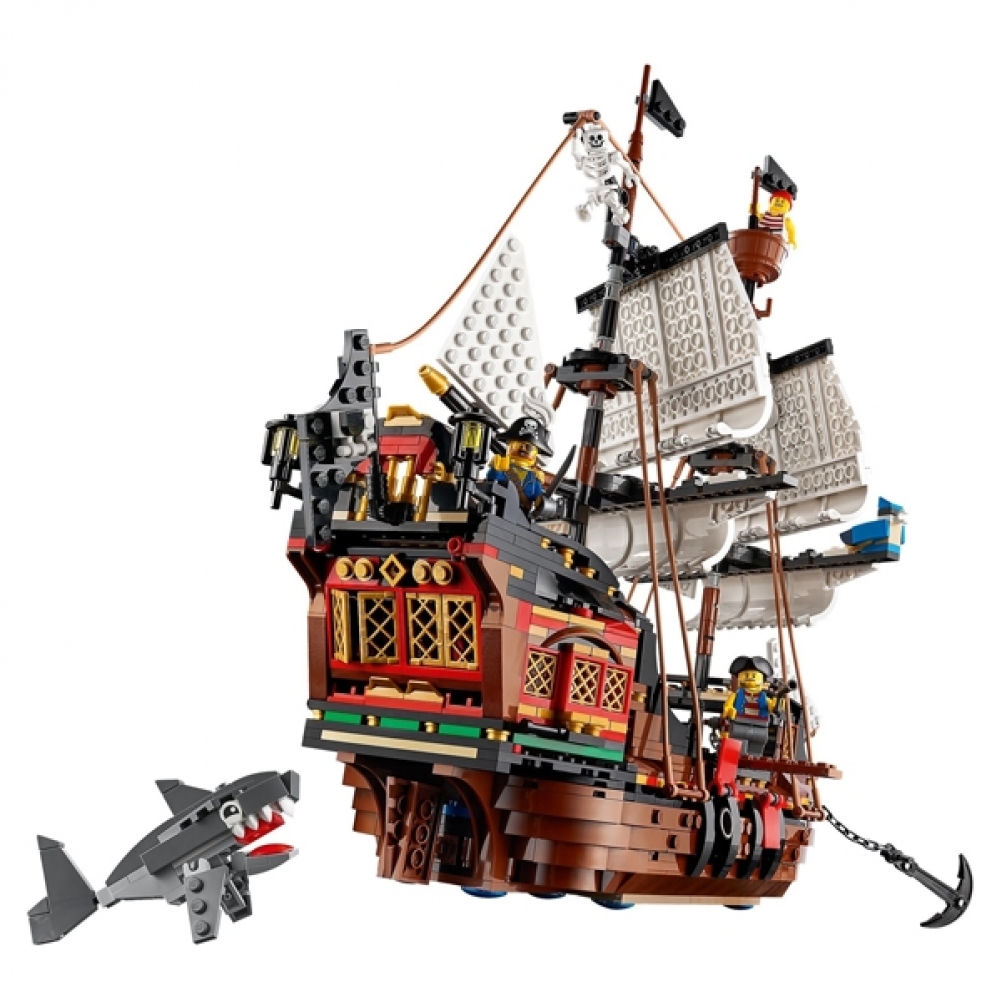 Questo magnifico e dettagliato set include un galeone dei pirati con vele e cannoni mobili, una cabina con il tetto e i lati apribili, 3 minifigure, personaggi costruibili tra cui uno squalo e un pappagallo, numerosi dettagli aggiuntivi costruiti con mattoncini e fantastici accessori per iniziare subito a giocare.