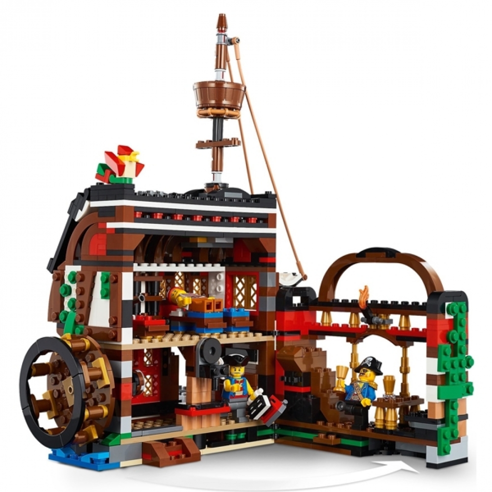 Un intero galeone di opportunità! I bambini possono esprimere la loro creatività e la capacità di costruzione giocando con il dettagliatissimo Galeone dei pirati, visitando la Taverna dei pirati per mangiare un boccone ed esplorando l'Isola del teschio oppure realizzando un modello completamente nuovo.