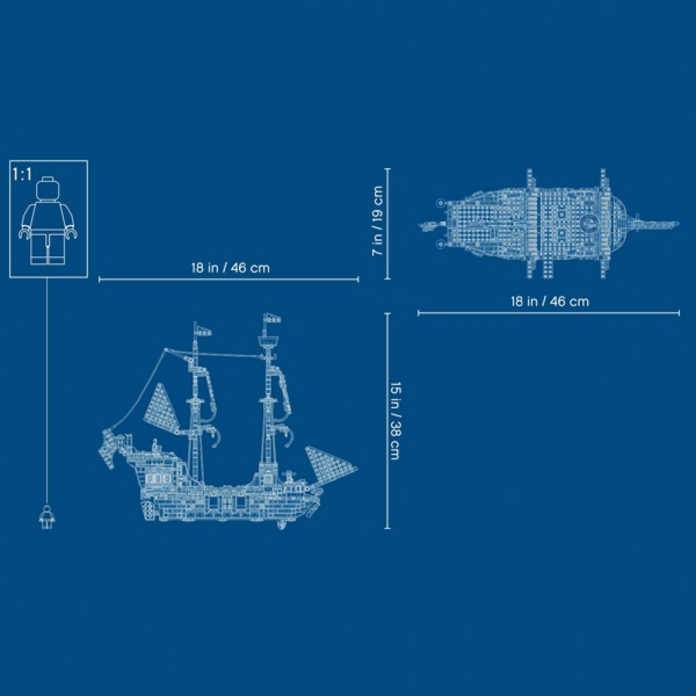 Il galeone dei pirati, che misura 37 cm di altezza, 46 cm di lunghezza e 19 cm di larghezza, è uno straordinario giocattolo d'azione ricco di fantastici dettagli e abbastanza grande da offrire tantissimo divertimento giocando da soli o in gruppo.