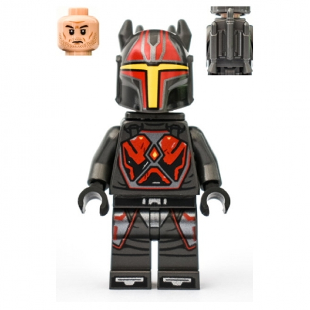 Indossa un’armatura nera con dettagli rossi e argentati sul torso e sulle gambe, tipica dei guerrieri mandaloriani imperiali. Il casco rosso presenta la classica T-visiera, mentre la testa sottostante è di colore nougat chiaro con espressione seria.