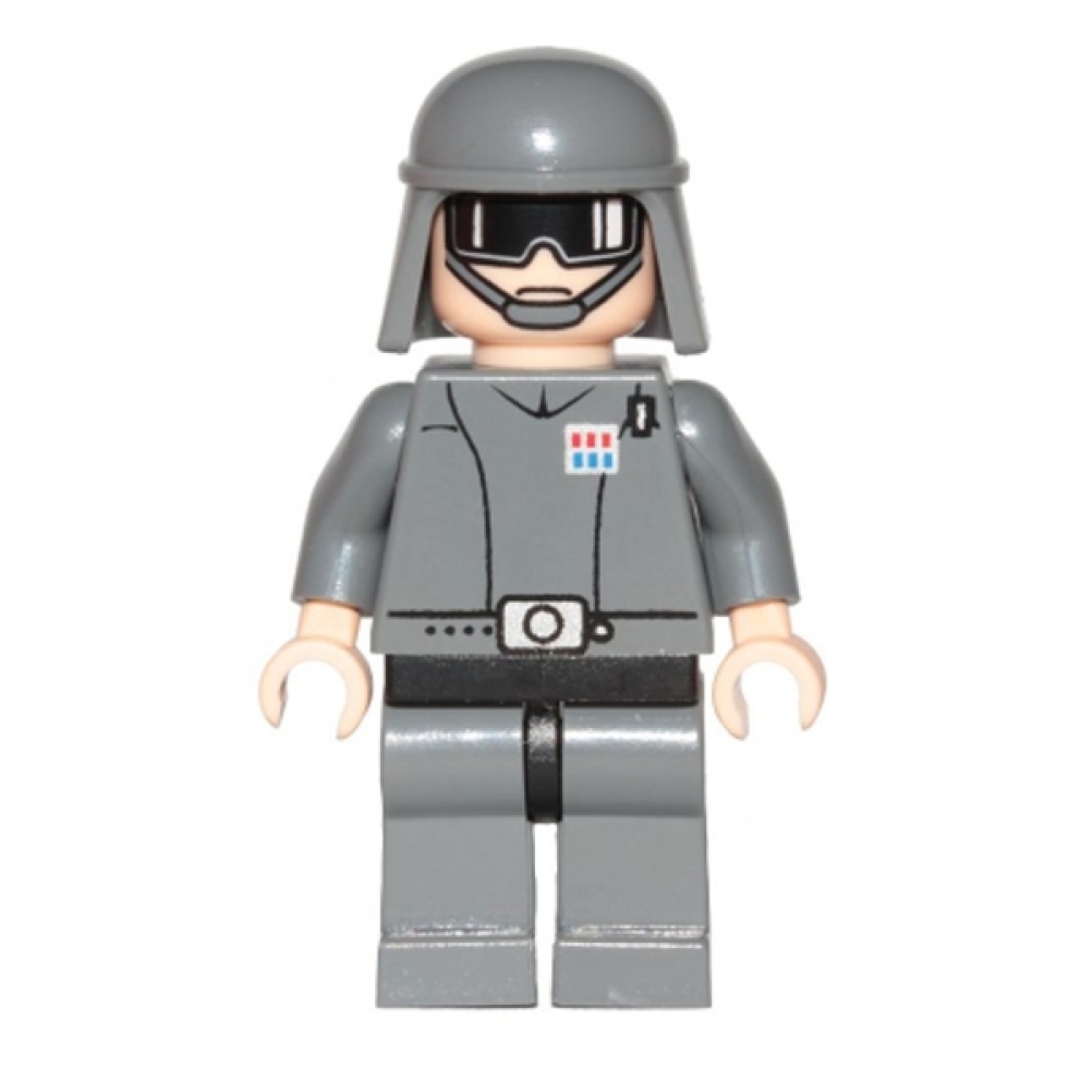 Minifigure del Generale Maximilian Veers con casco grigio-blu scuro e stampa degli occhiali sul casco, torso e gambe stampati in uniforme imperiale. Testa color nougat senza ulteriori dettagli.