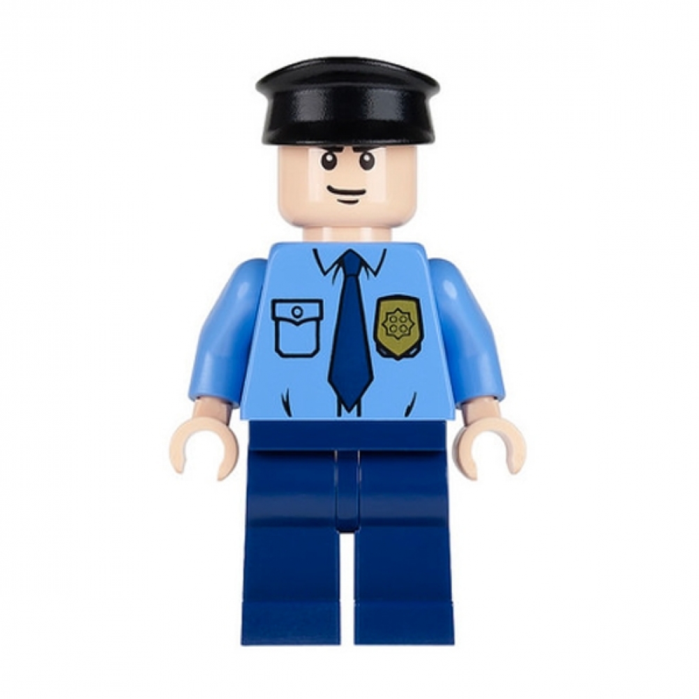 Minifigure LEGO Poliziotto / Guardia (SH0023), inclusa nel set 6860 - The Batcave. Indossa una divisa blu scuro con giubbotto antiproiettile stampato, distintivo argentato e cintura. Pantaloni blu scuro e cappello da poliziotto abbinato. Senza accessori (arma o radio non inclusi).