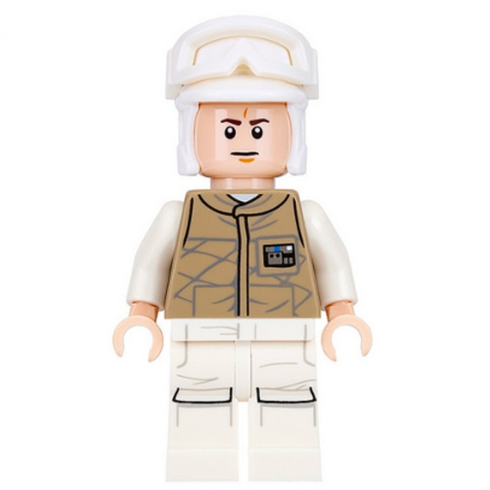 Minifigure LEGO® Star Wars del 2016 con uniforme invernale color sabbia scuro, volto serio con espressione corrugata, casco classico e zaino tattico. Ideale per completare le scene di battaglia ambientate su Hoth, aggiungendo varietà e realismo alla tua collezione.