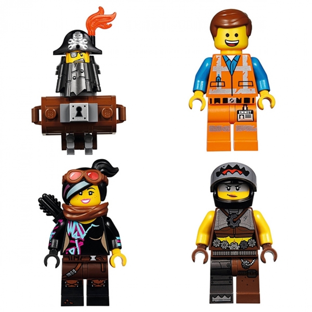 Include 6 personaggi di LEGO® MOVIE 2™: una minifigure LEGO di Emmet, una minifigure di Lucy e una minifigure di Sharkira, più 3 personaggi in mattoncini: Barbacciaio, Stella e Cuore.