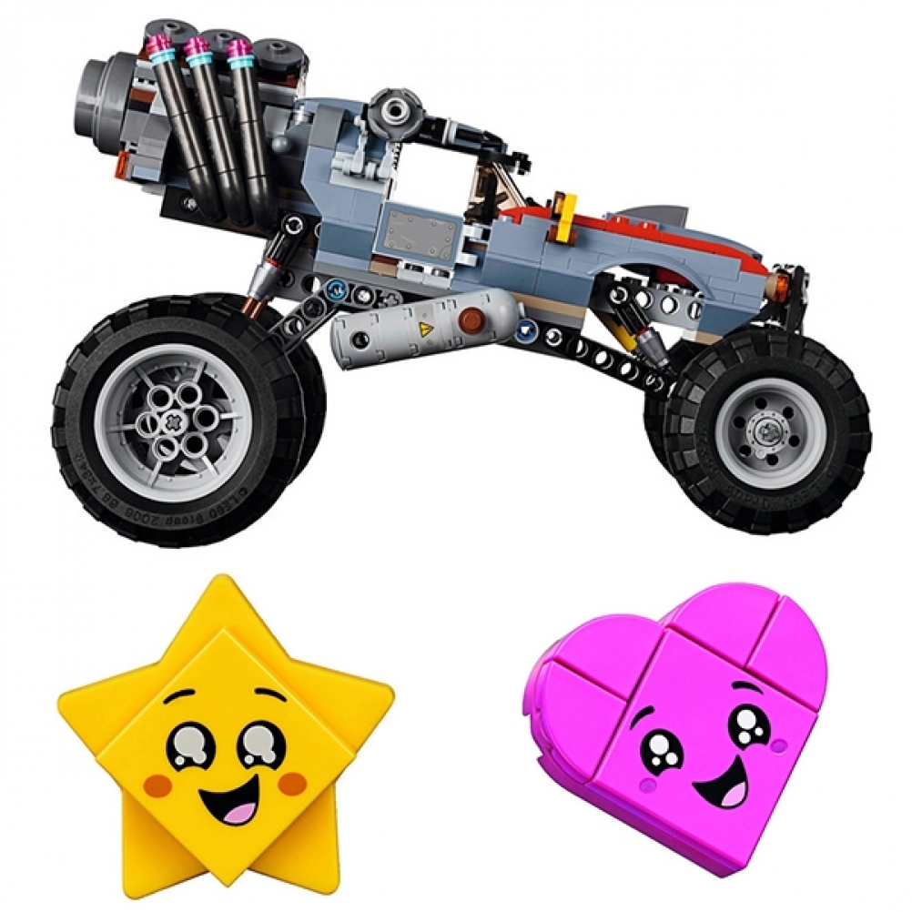 Fuggi via dal pericolo sul Buggy fuggi-fuggi di Emmet e Lucy THE LEGO® MOVIE 2™ 70829, dotato di 2 sedili per minifigure, sportelli e cofano apribili, spara-frecce apribile (non funzionante) e sospensioni.