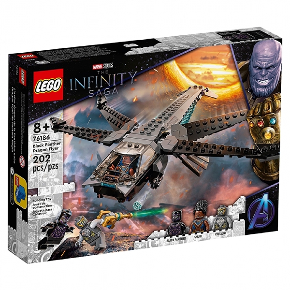 Include 3 minifigure per ispirare il gioco di fantasia: Black Panther, sua sorella Shuri e un malvagio guerriero Chitauri armato di un potente blaster. Il dragone volante costruibile è dotato di 2 shooter. I bambini possono muovere le 4 ali dell’aereo in avanti, indietro, su e giù mentre ricreano l’azione ad alta velocità del film Marvel, sparando con gli shooter e schivando i blaster del nemico. Un regalo di compleanno, di Natale o per le feste speciale per i fan dei film Marvel dagli 8 anni in su. Il dragone volante misura oltre 4 cm di altezza, 22 cm di lunghezza e 28 cm di larghezza e si integra facilmente con altri kit di costruzione LEGO® Marvel.